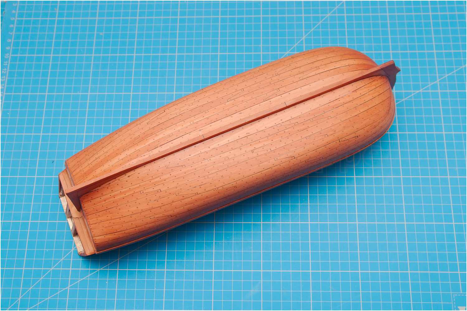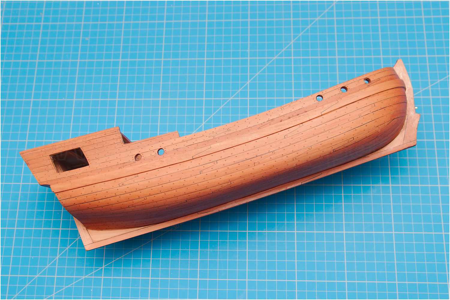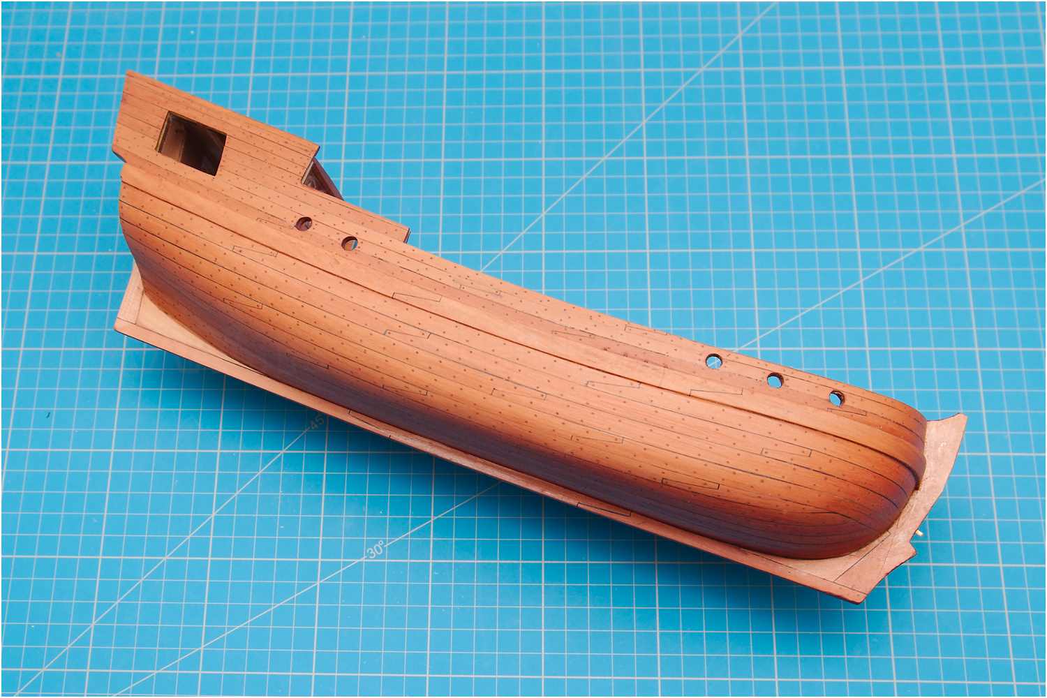 Je mehr Aufmerksamkeit und Mühe in die Herstellung des Basiskorpus gesteckt wird, um so leichter ist die spätere Beplankung. Der hier noch ungeschliffene Rumpf lässt gut die saubere Vorarbeit erkennen.