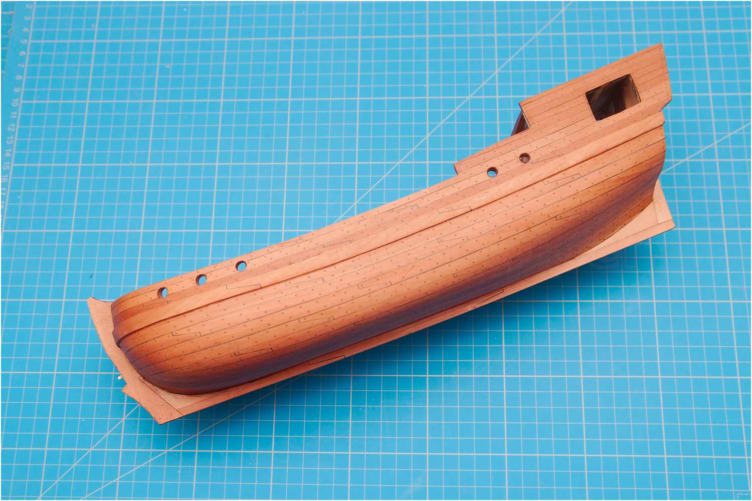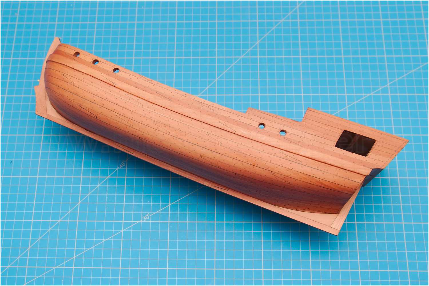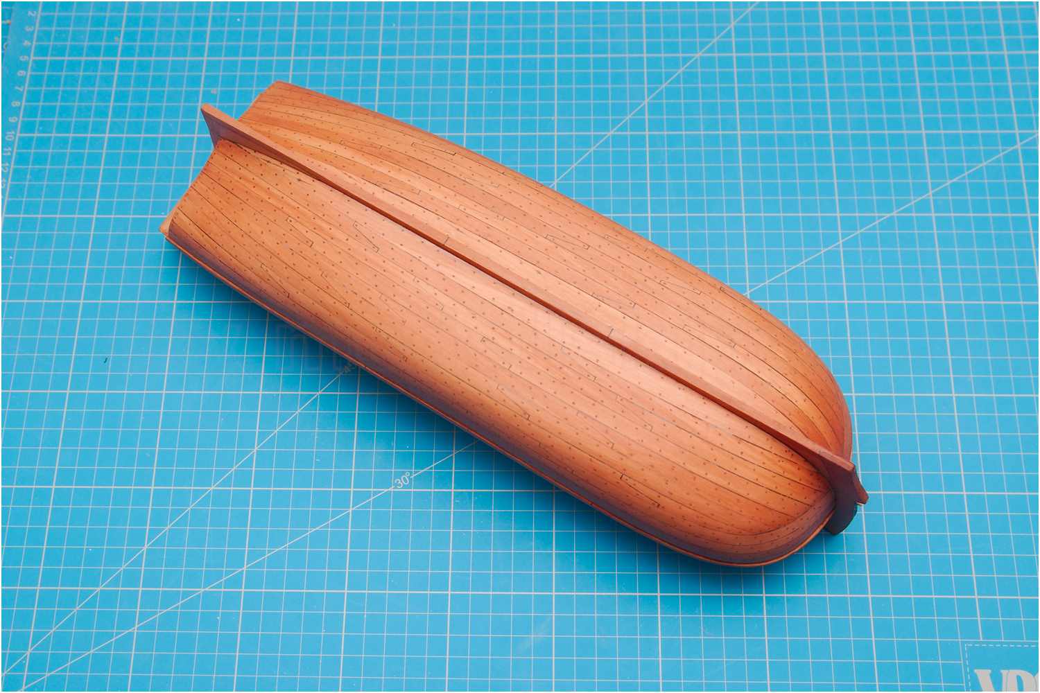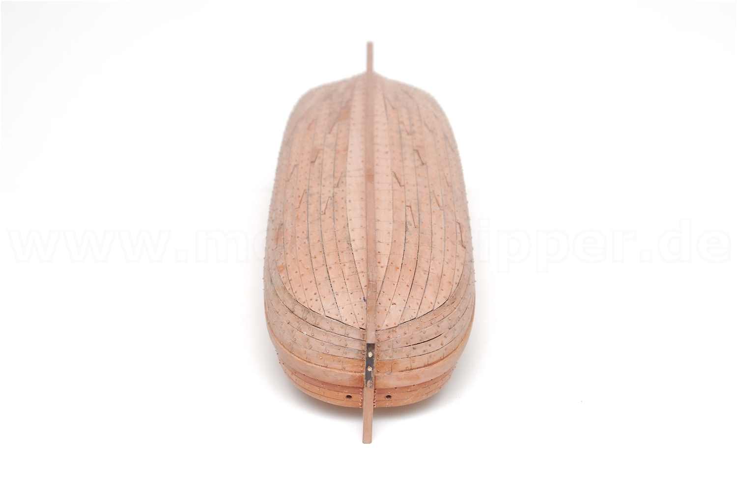 Je mehr Aufmerksamkeit und Mühe in die Herstellung des Basiskorpus gesteckt wird, um so leichter ist die spätere Beplankung. Der hier noch ungeschliffene Rumpf lässt gut die saubere Vorarbeit erkennen.