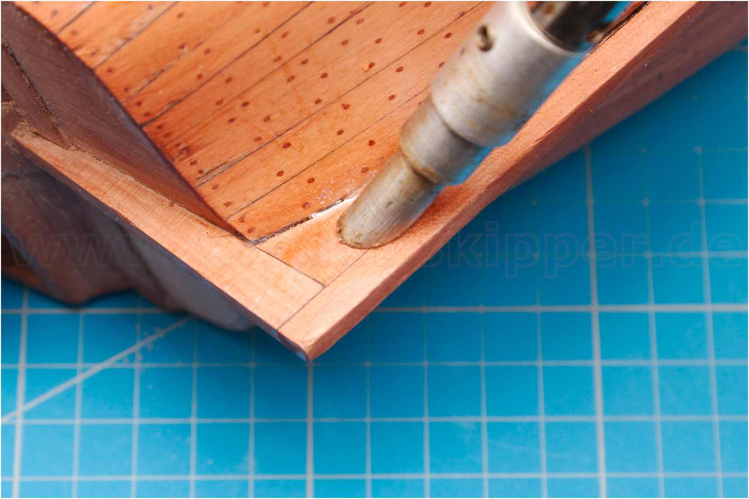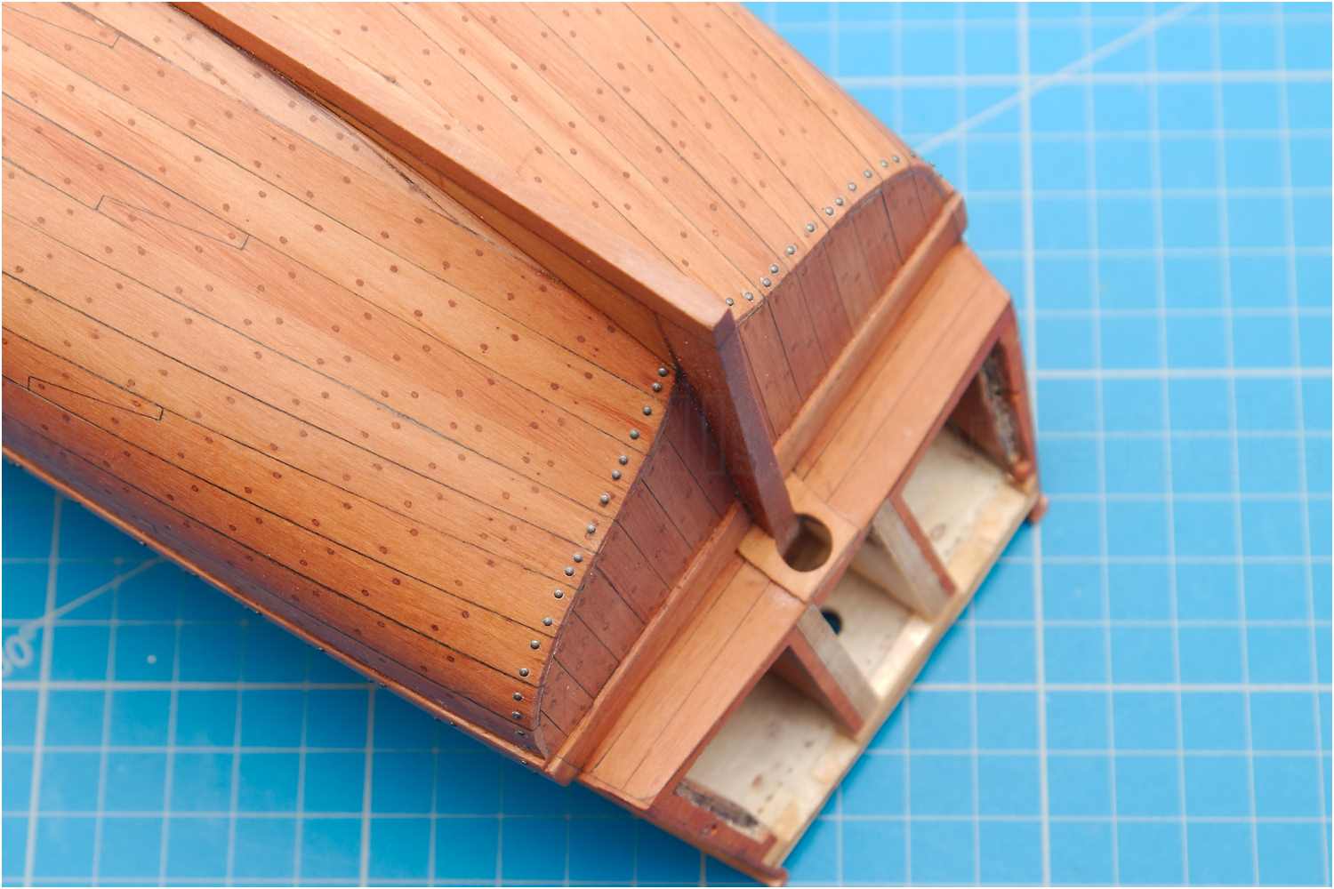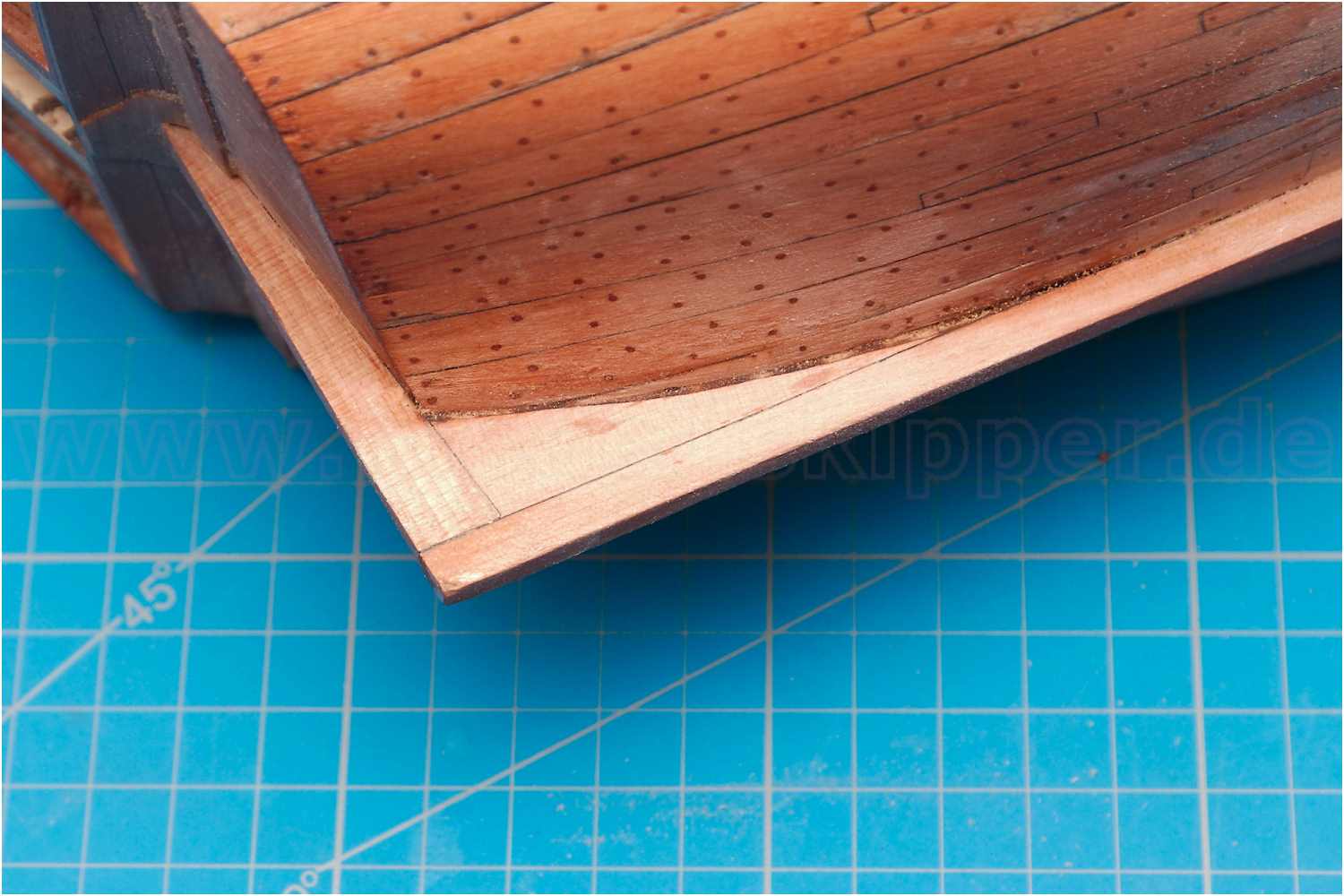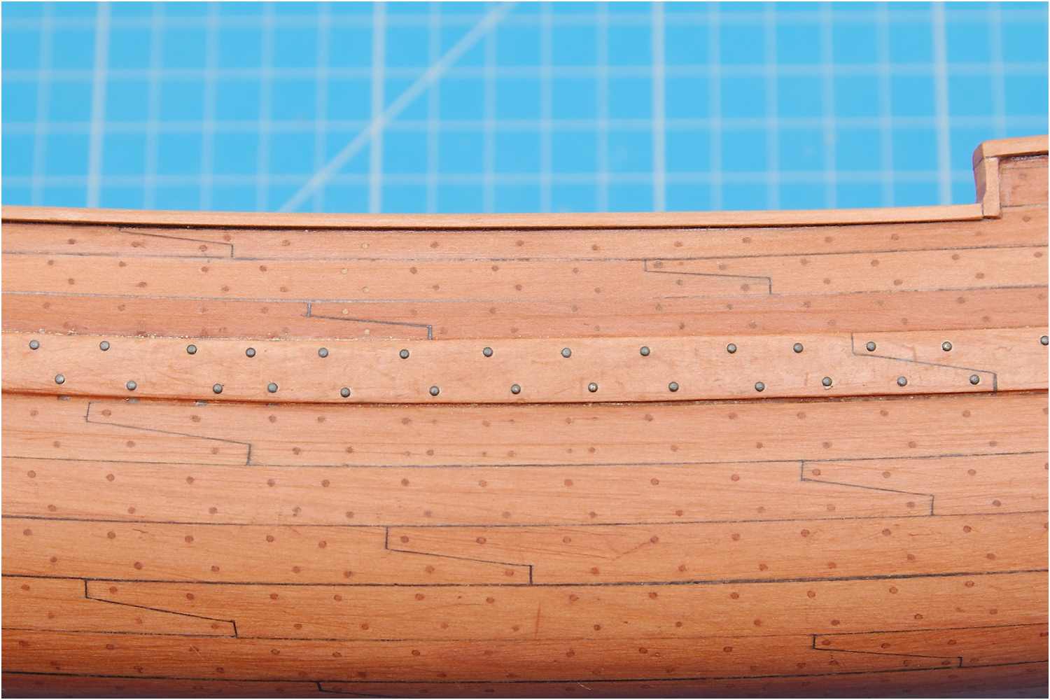 Nach dem kompletten Schliff und Lackierung des Rumpfes, wurden die Berghölzer und Plankenenden, in Anlehnung an die Statenjacht Utrecht und im Unterschied zu den sonst gedübelten Planken, mit Messingbolzen versehen.