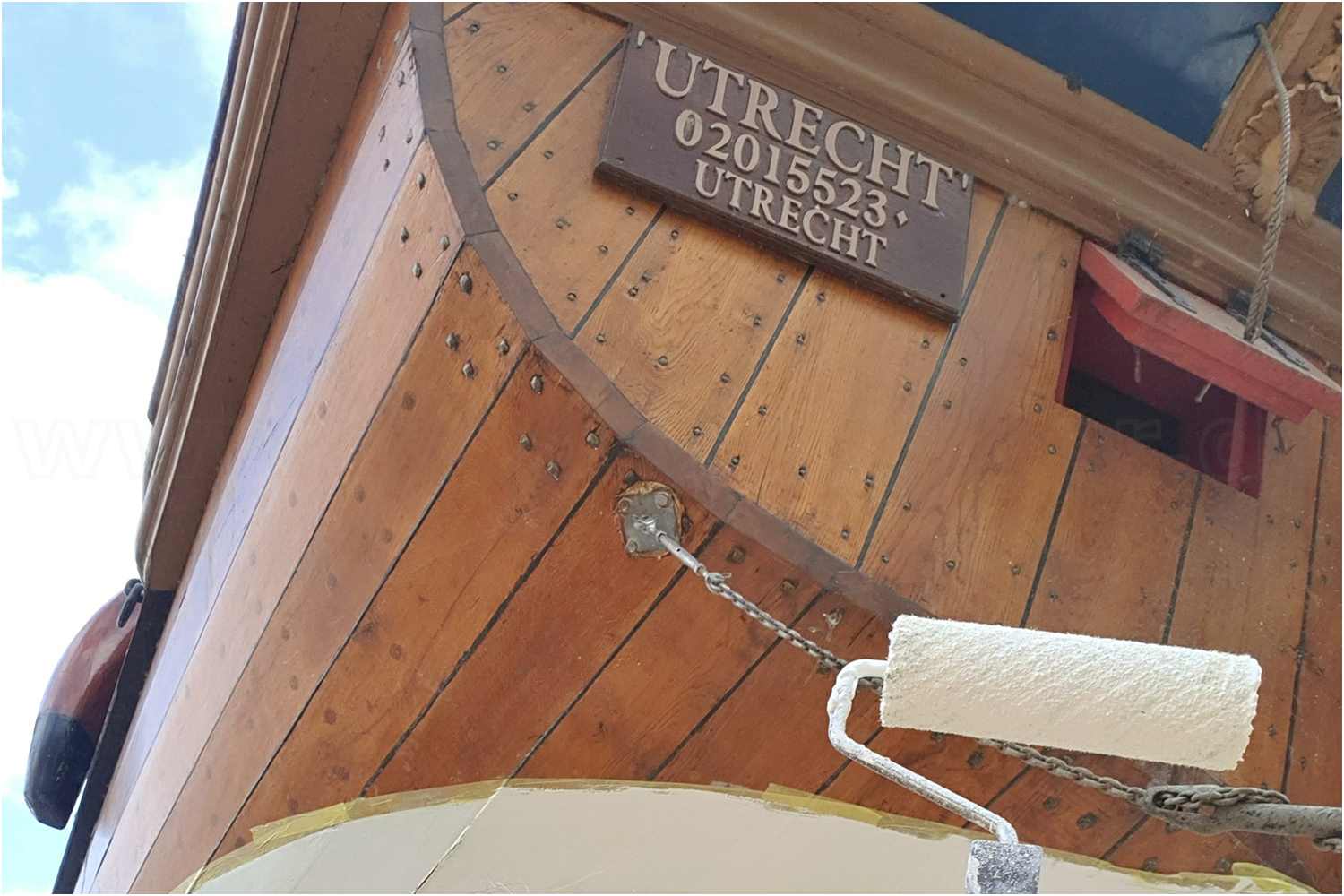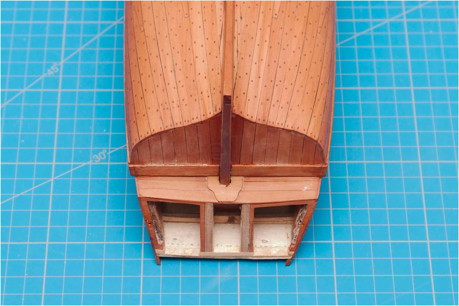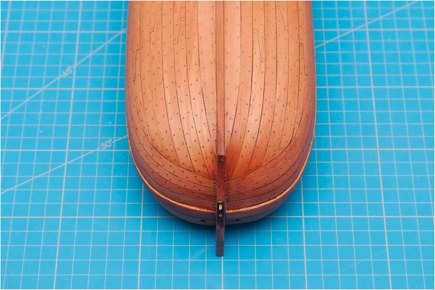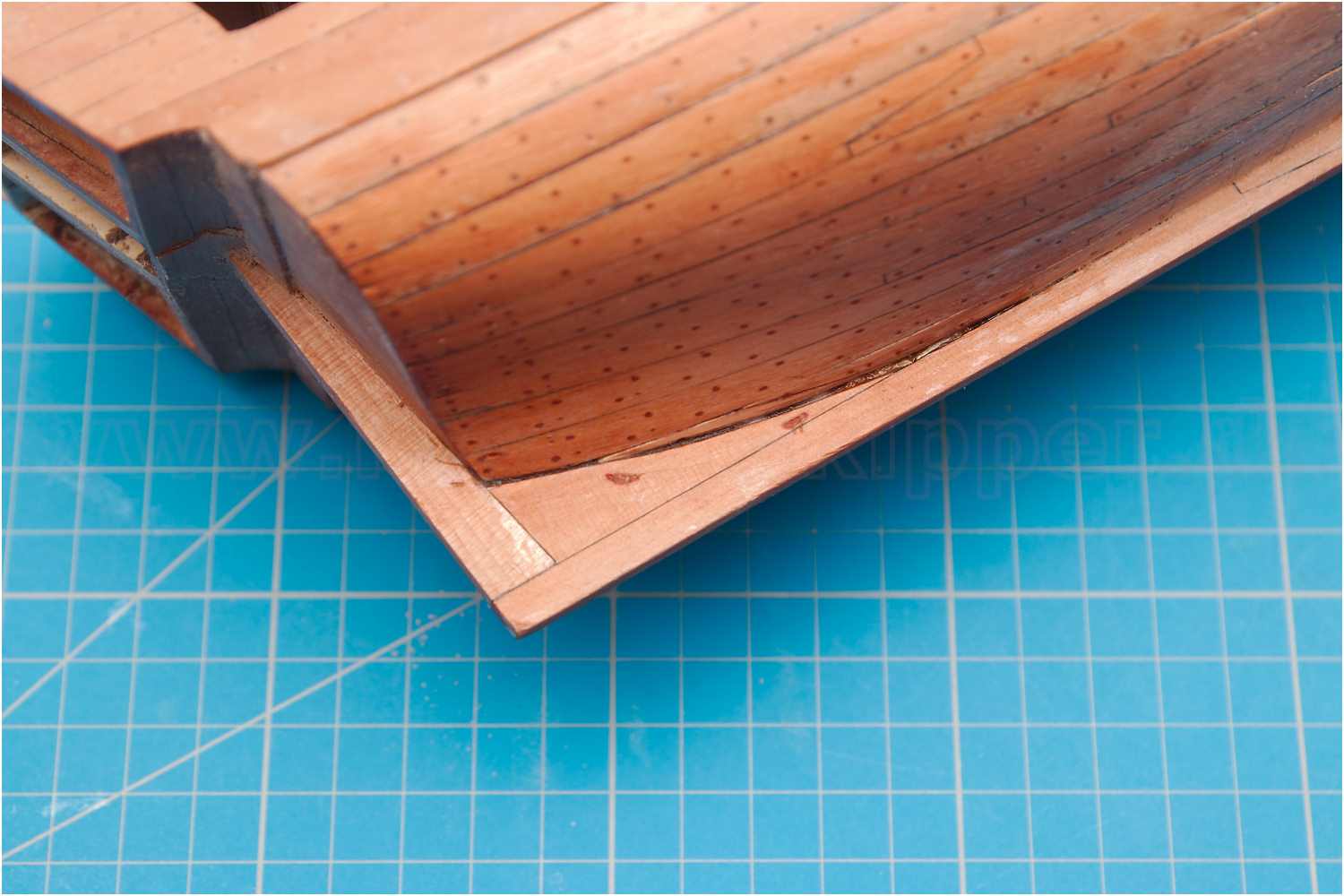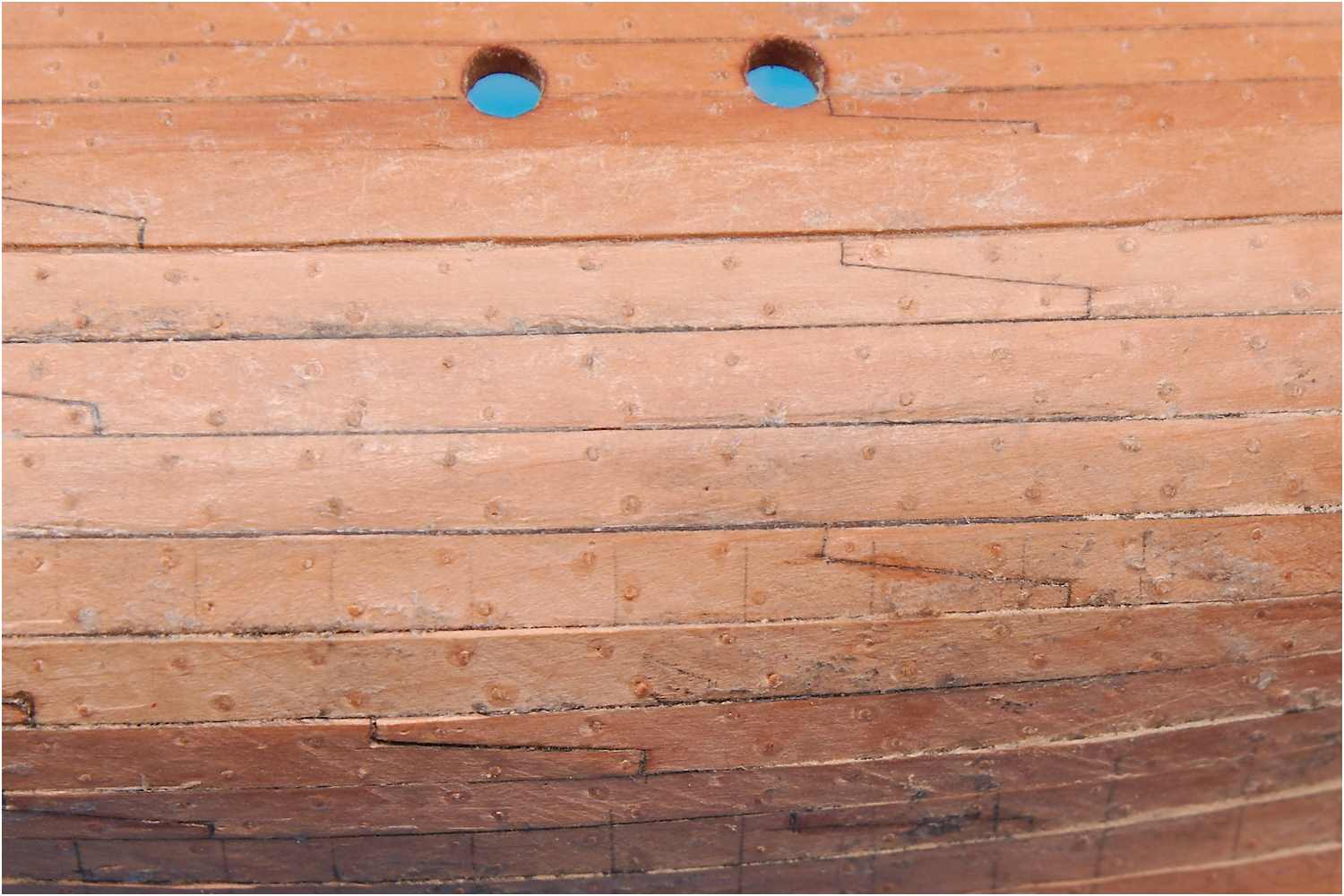 Nach dem kompletten Schliff und Lackierung des Rumpfes, wurden die Berghölzer und Plankenenden, in Anlehnung an die Statenjacht Utrecht und im Unterschied zu den sonst gedübelten Planken, mit Messingbolzen versehen.