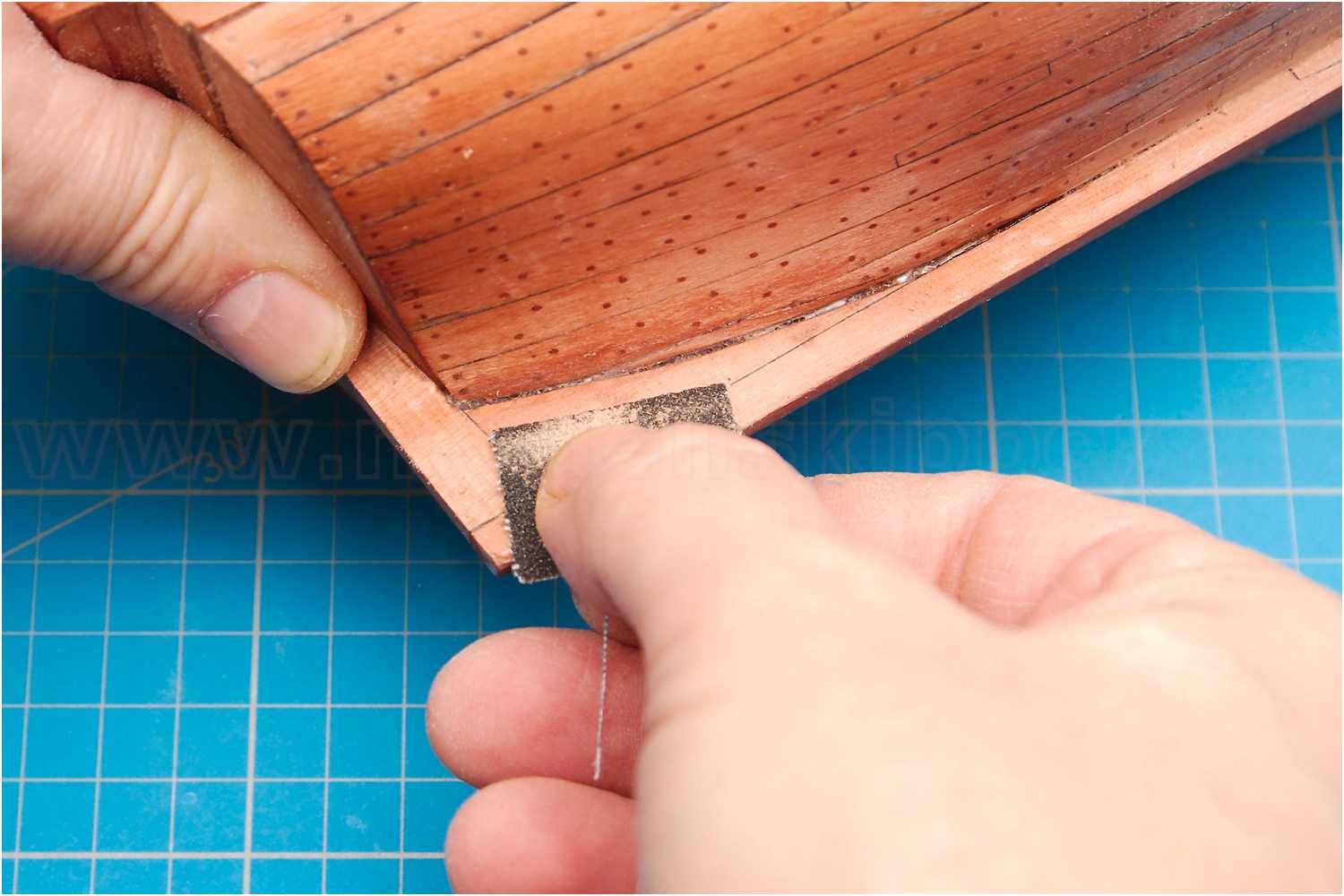 Erstschliff der Beplankung - für etwa 30 % der Backbordseite habe ich ca. 2 Stunden geschliffen. Erst trocken mit 80er-Körnung, dann Firnis-Feuchtschliff mit 100er-Körnung.