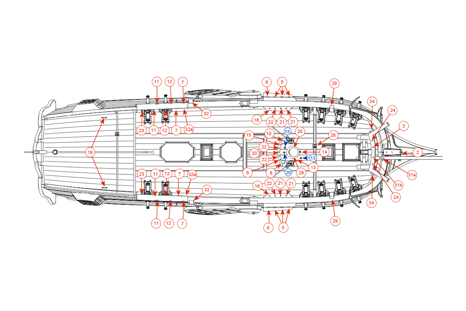 Q: 203 (247) auf dem Ring befindet sich ein Bügel für den nach achtern zeigenden Einholer, ein Bügel für den nach vorn zeigenden Ausholer, sowie ein Haken für den Klüverhals, gleitet auf dem Bugspriet, Ring ist bekleidet 31a Ausholer: läuft von einem Bügel am Ring nach vorn zum Scheibgatt im Bugspriet hinter dem Knie NJ 186 (204), zurück durch das Loch in der Sprietauflage NJ 185 (202), belegt an Klampe am Bugsprietfuß 31b Einholer: läuft von anderen Bügel am Ring nach achtern, belegt am inneren Stb-Nagel auf der Spillbeting Garn: 3x8 Skala 360 |