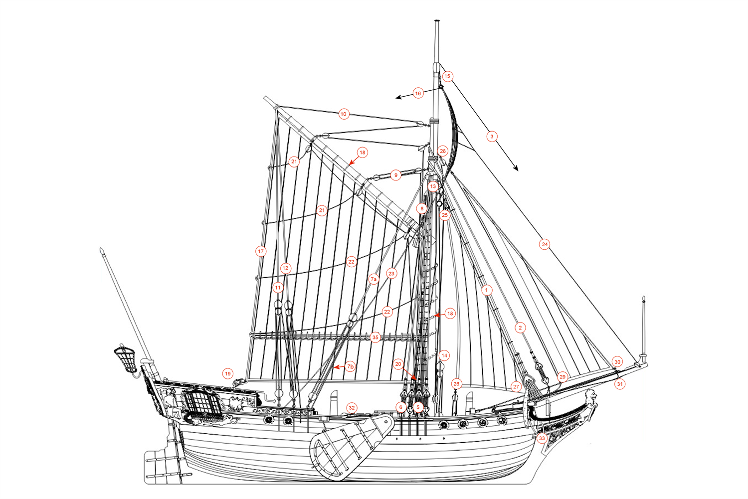 Q: 195 (228) stehende Part an der Topprahnock, laufen zu Leitblöcken auf der stehende Part des Piekfalls, über Leitblöcke an der achteren Want, weiter durch Leitkauschen, belegt am achteren Nagel an den Nagelbänken bei den Wanten Garn: 3x3 Tera 420 |