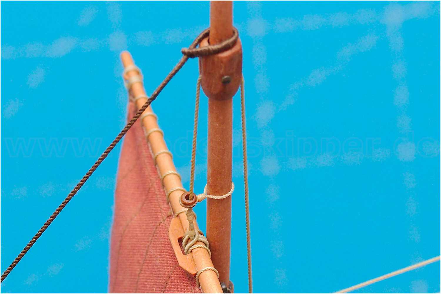 Q: 197 (234 ff) oberes Liek mit Marlschlag an der Gaffel angeschlagen, Legel am Vorliek mit Rackbändsel als Variante mit Reihleine und Klotjes Garn: 3x3 Alterfil 180 |