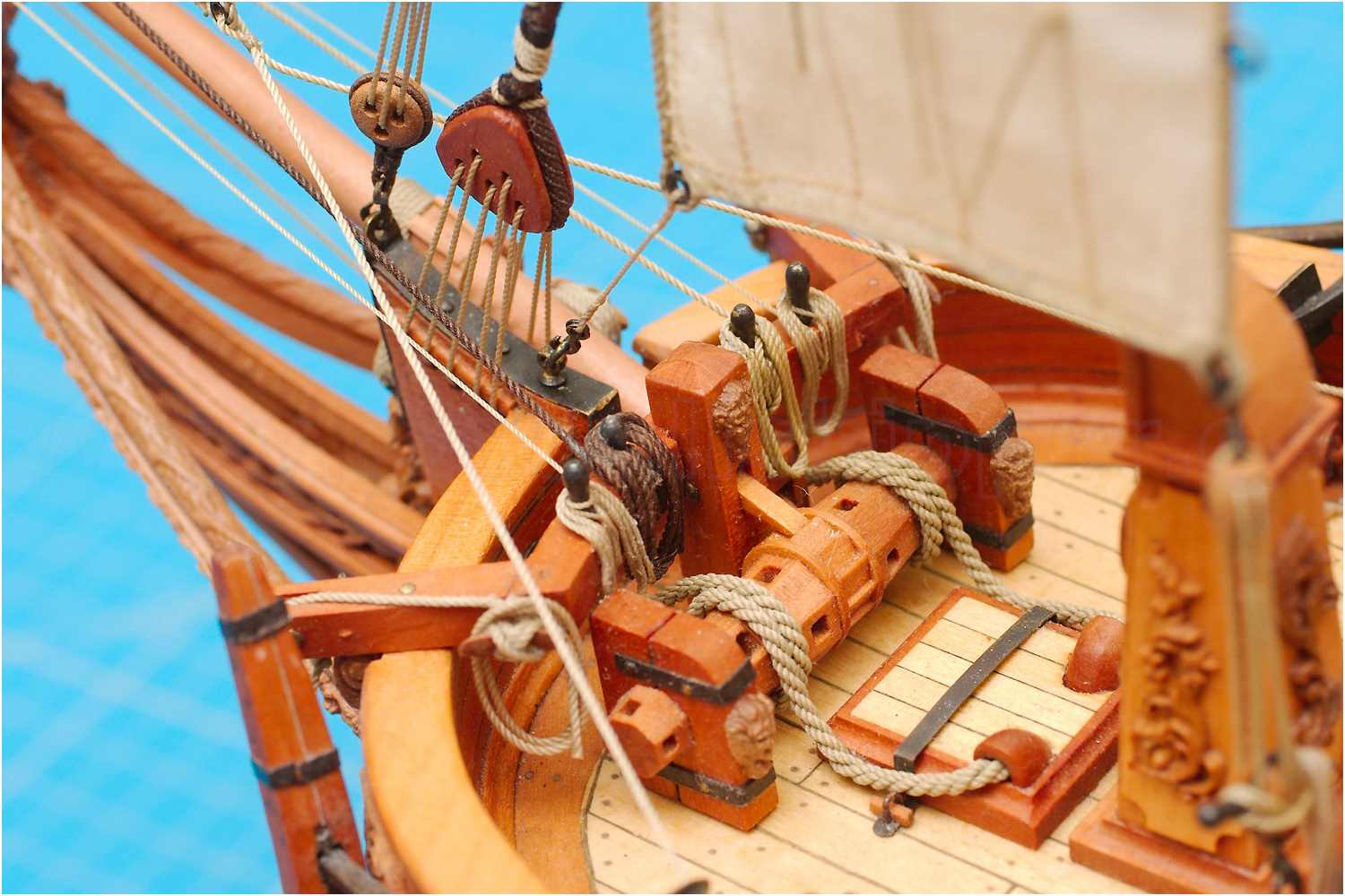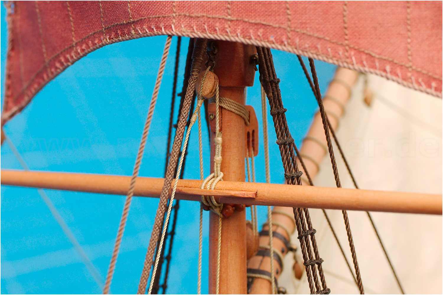 Q: 194 (225) 1 x E-Block (6 mm) stehende Part als Drehreep auf Mitte der Rah, teilt sich mit Fockfall [25] einen Doppelblock vorn am Hummer kurz unter dem Kalbenbrett, Tau muss so lang sein, dass Rah bis aufs Schanzkleid gefiert werden kann Läufer wird als einfaches Jolltau steifgesetzt, Block der Jolle wird rechts vor dem Mast in Augbolzen eingehakt belegt am unteren Nagel an Stb-Mastklampe Garn: 3x5 Skala 240 |