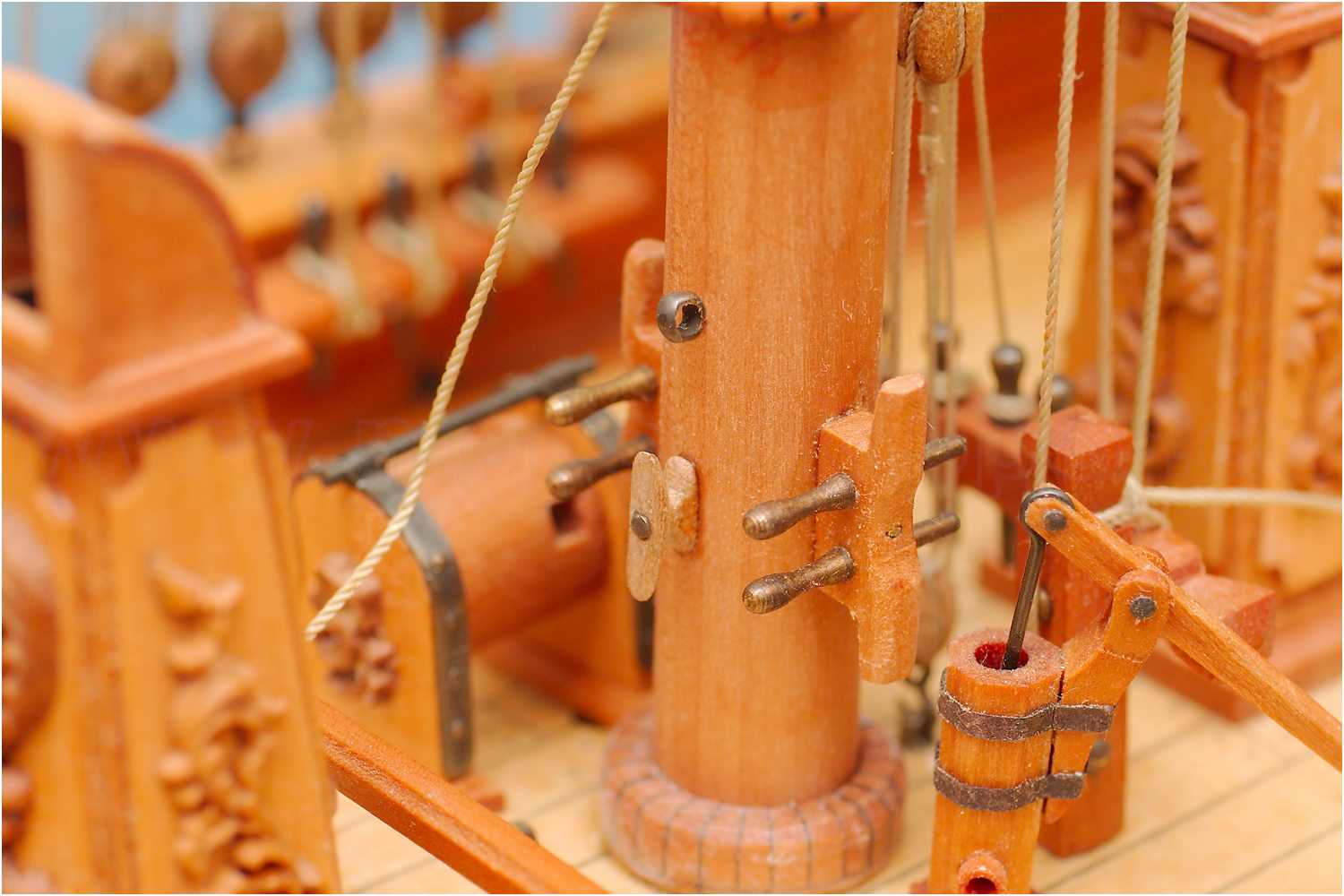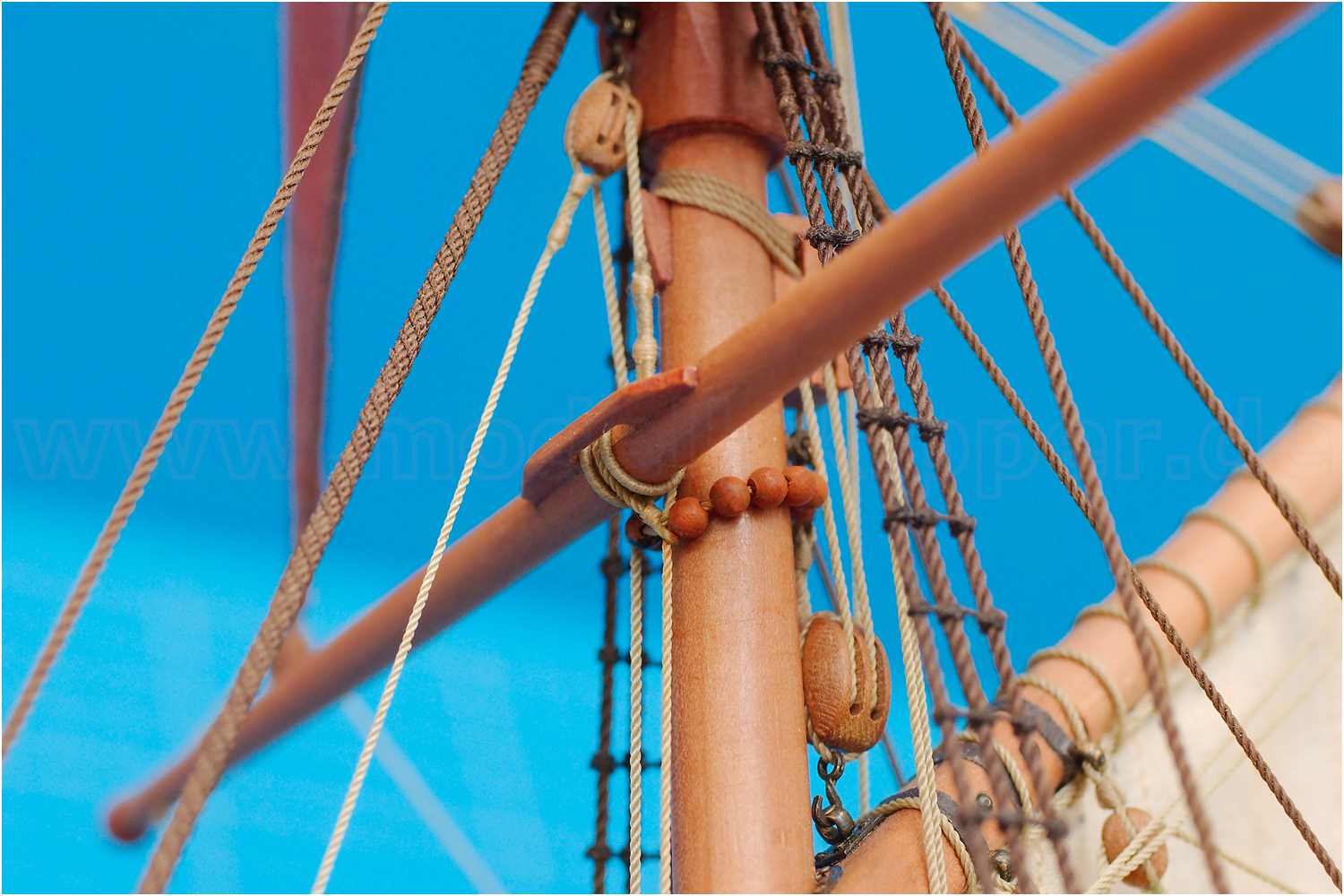 Q: 194 (226) 1 x Violine (7 mm), 1 x E-Block (5 mm) einfaches Perlenrack, wird dichtgeholt mit am Mastfuß eingehakter Talje belegt an Klampe am Mastfuß unter der Talje Garn: Niederholer 3x5 Skala 240, Läufer 3x3 Skala 240 |