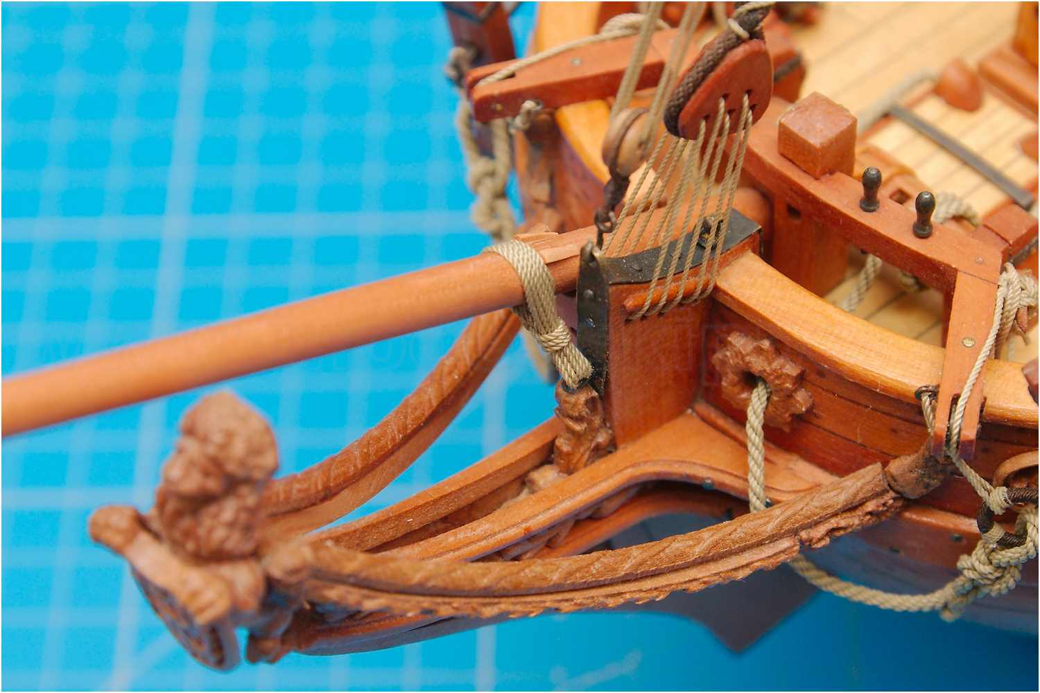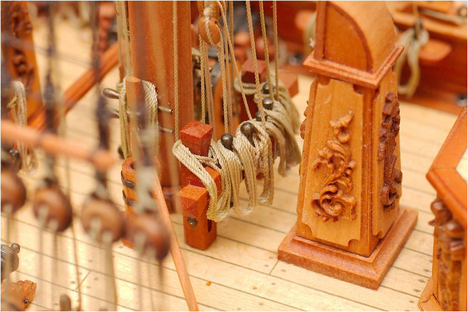 Q: 189 (214, 220) 1 x E-Block (7 mm) loses Auge, bekleidet, liegt über der Tonne der Stenge, läuft über Leitblock am Bugsprietknie, belegt an inneren Bb-Nagel der Spillbeting Garn: 3x5 Alterfil 180 |