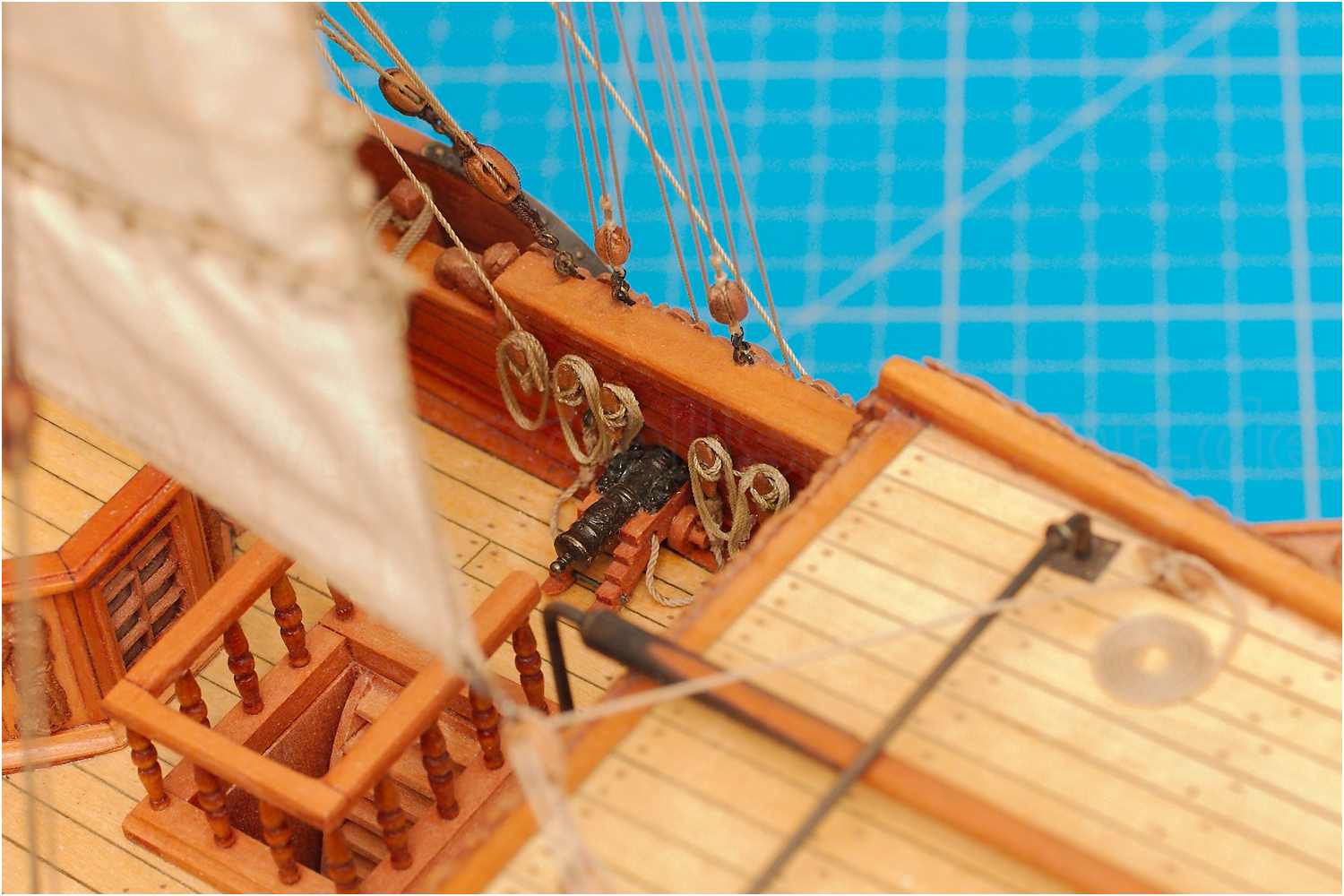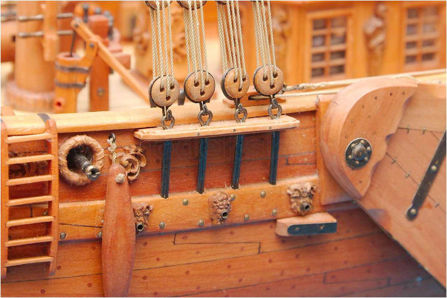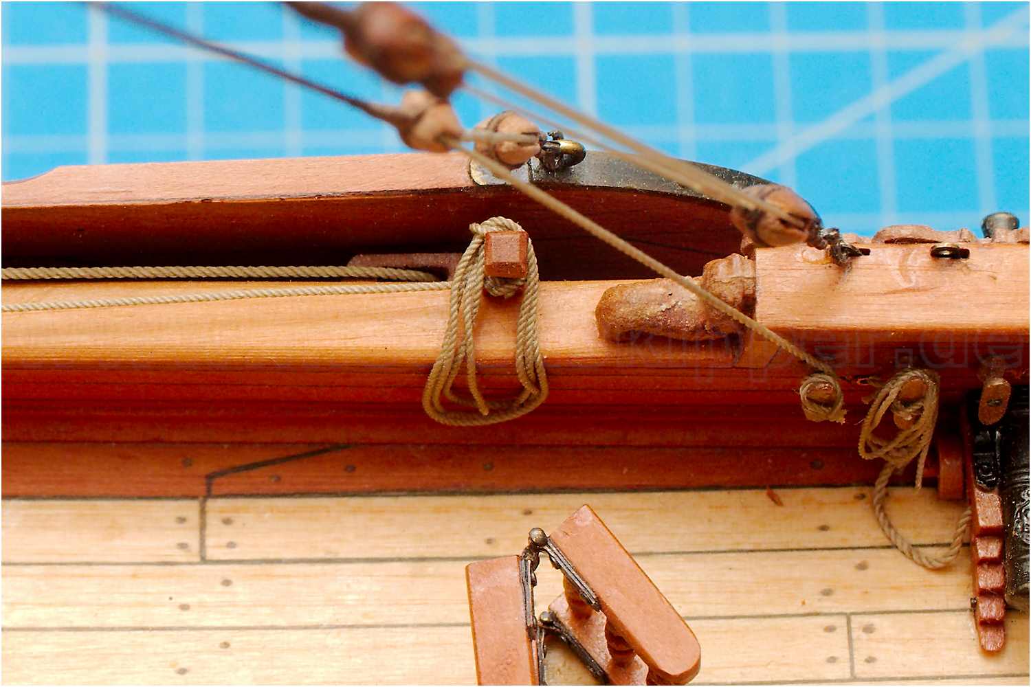 Q: 194, korrigiert nach JU 2 x Violine (7 mm), 2 x E-Block (5 mm) Doppelschenkel zusammen mit [11], eingehakt am Gaffelnockbeschlag, Verhältnis Schenkel zum Läufer 3:1, unterer Block der Taljen eingehakt in den Püttings am Setzbord, laufende Part läuft durch ein Loch im Schanzkleid siehe NJ 195 (225) belegt links und rechts an der dritten Klampe Innenseite Setzbord, hinter den Backstagen [7] Garn: Schenkel 3x6 Skala 200, Läufer 3x2 Skala 200 |