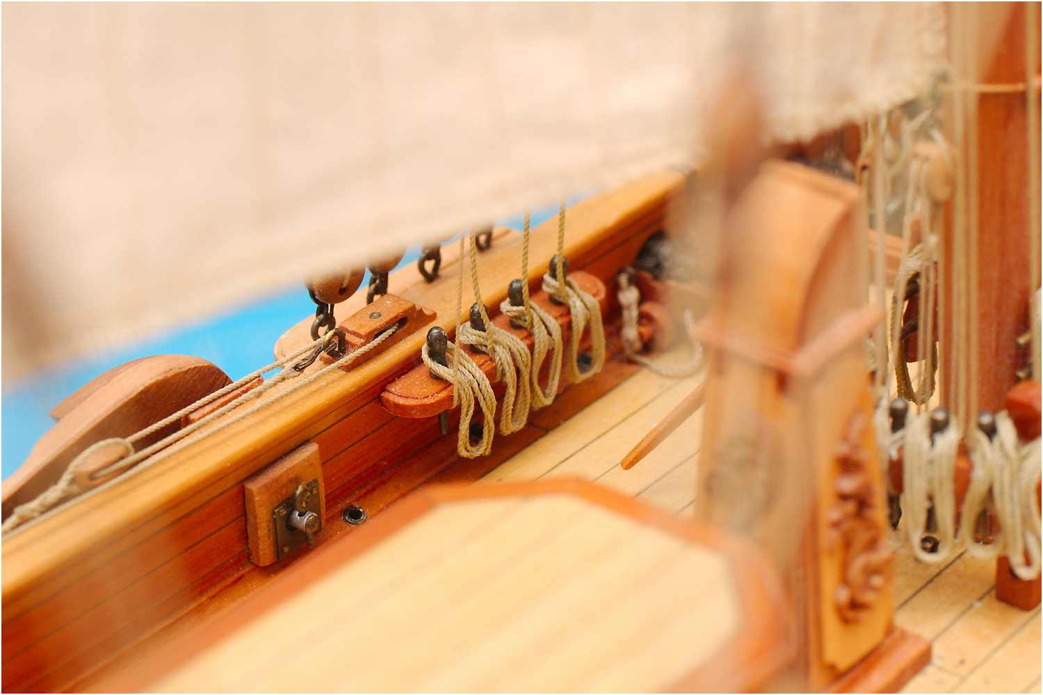 Q: 198 (239), 200 (243) 4 x E-Block (5 mm) und 2 x D-Block (5 mm) die beiden Dempgordinge, jeweils an Bb und Stb am 1. und 2. Legel von oben am Achterliek des Gaffelsegels über Leitblöcke an den Gaffelbeschlägen, laufen über den vorderem D-Block am Gaffelschuh, über Leitkauschen an der mittleren Want belegt beiden mittleren Nägeln auf den Nagelbänken bei den Wanten Garn: 3x6 Tera 420 |