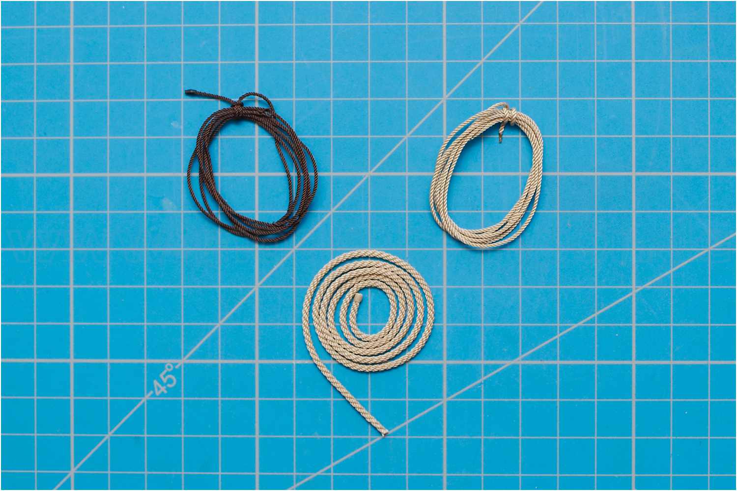 Alle Taue des stehenden und laufenden Gutes sowie Bändselgut werden selber hergestellt, dafür nutze ich Garne der Fa. Gütermann.