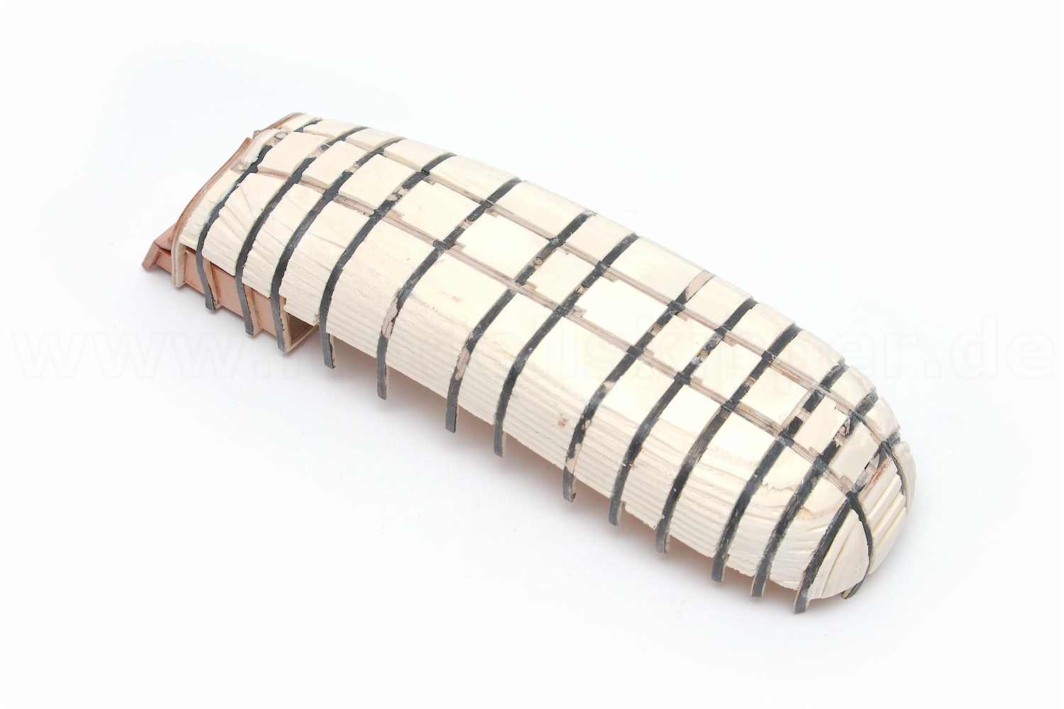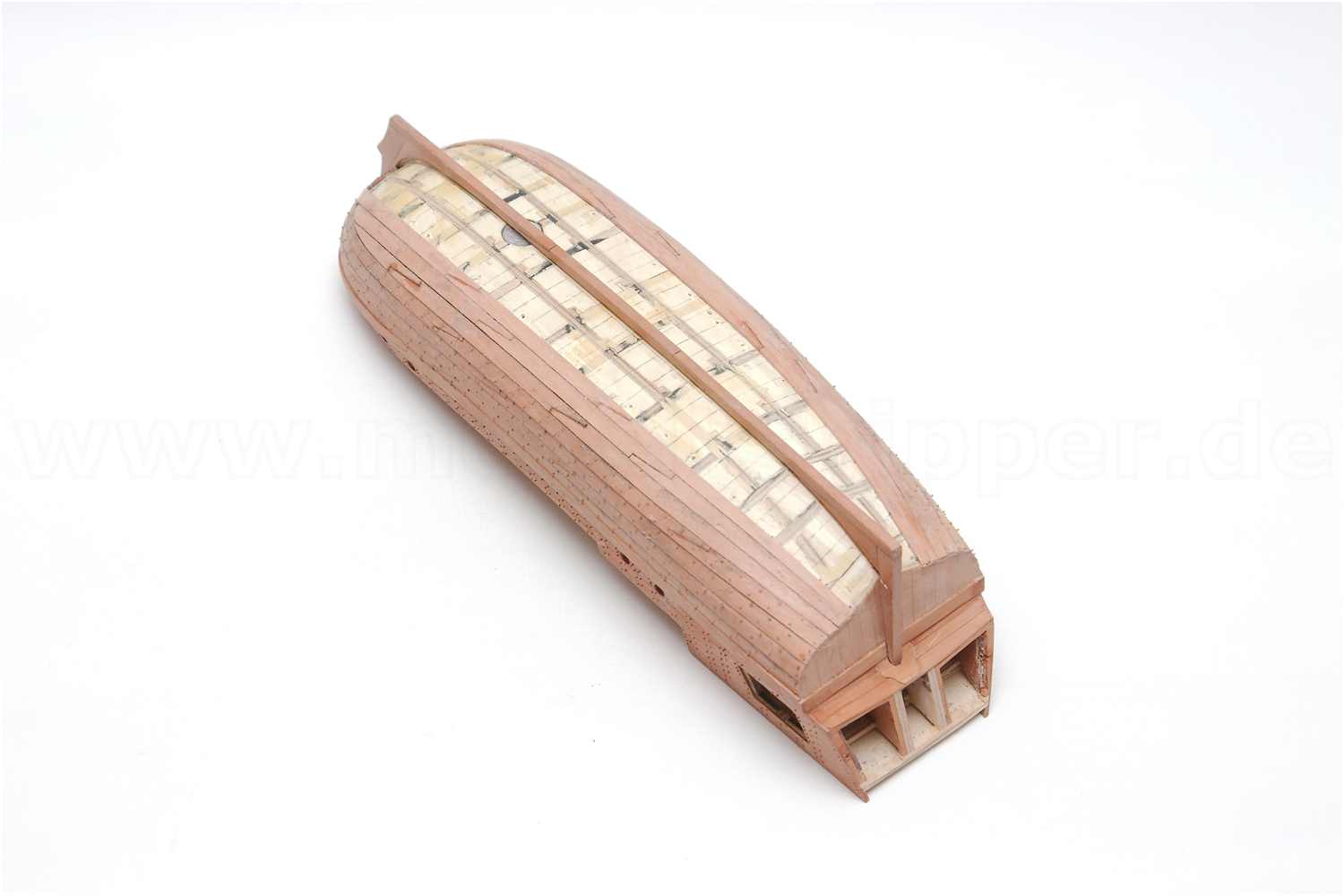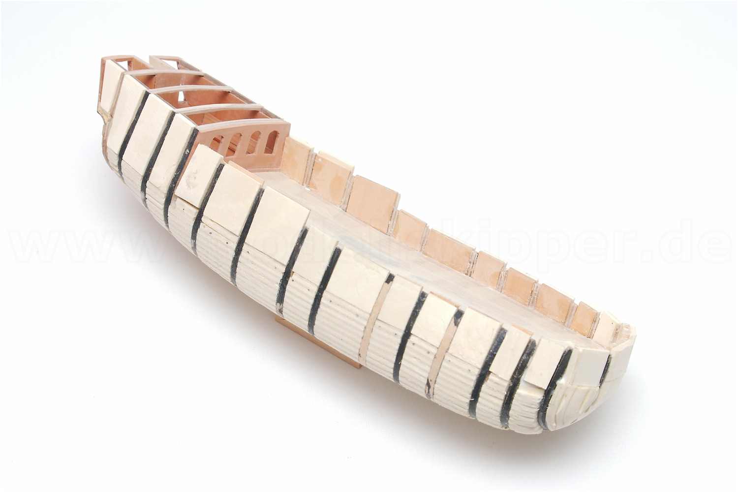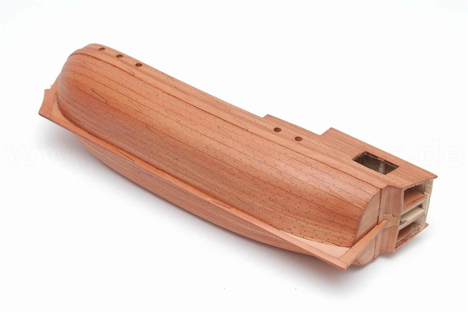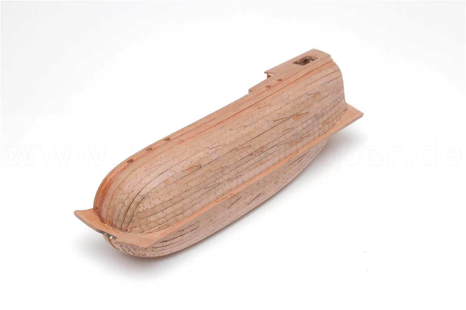 168 Std.: Rumpfkorpus geschliffen, Stückpforten eingesetzt und Erkerfenster ausgeschnitten