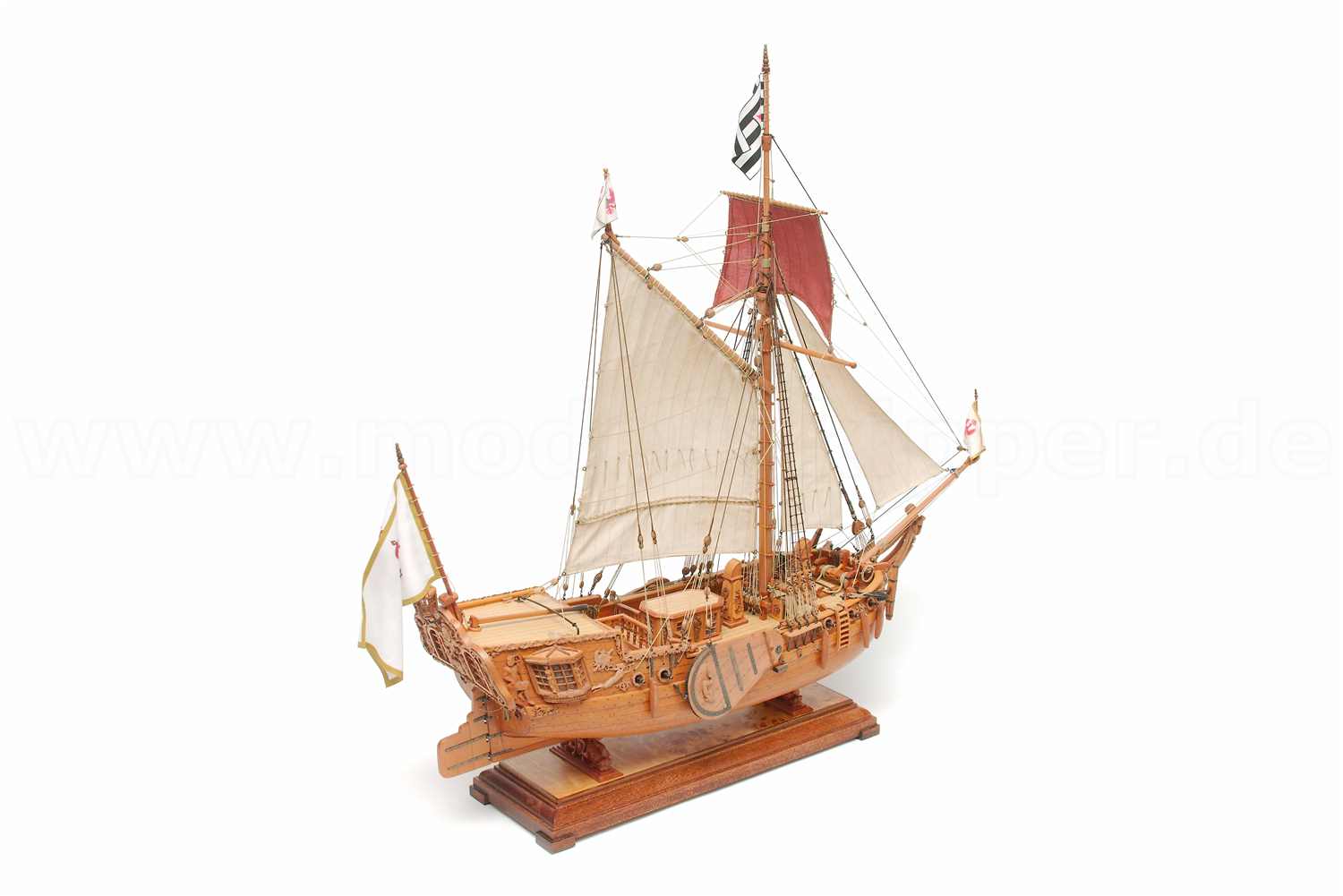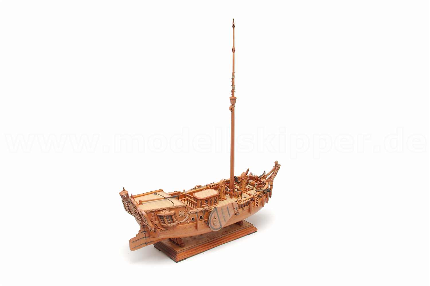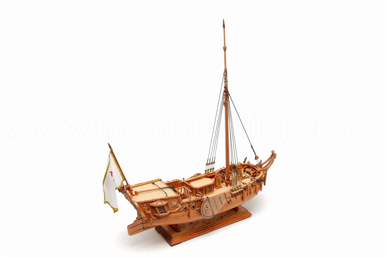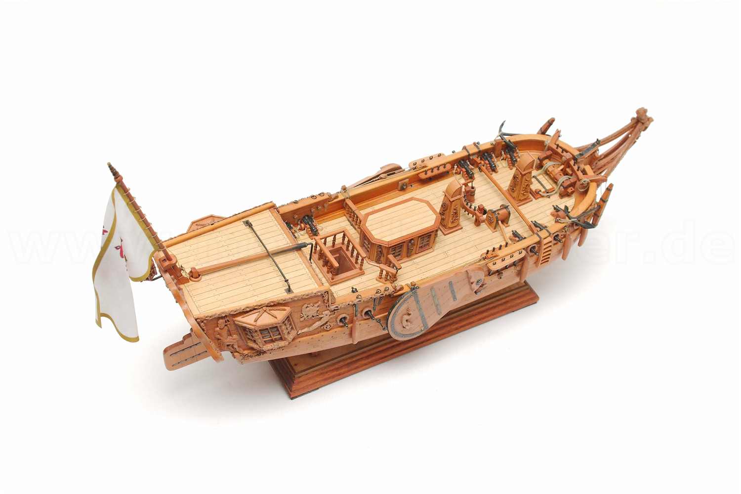 734 Std.: mit Setzen der "großen Flagge ", einem neuen Ständerbrettchen, fertigen Kanonen und Laterne sind die Detailarbeiten am Rumpf abgeschlossen