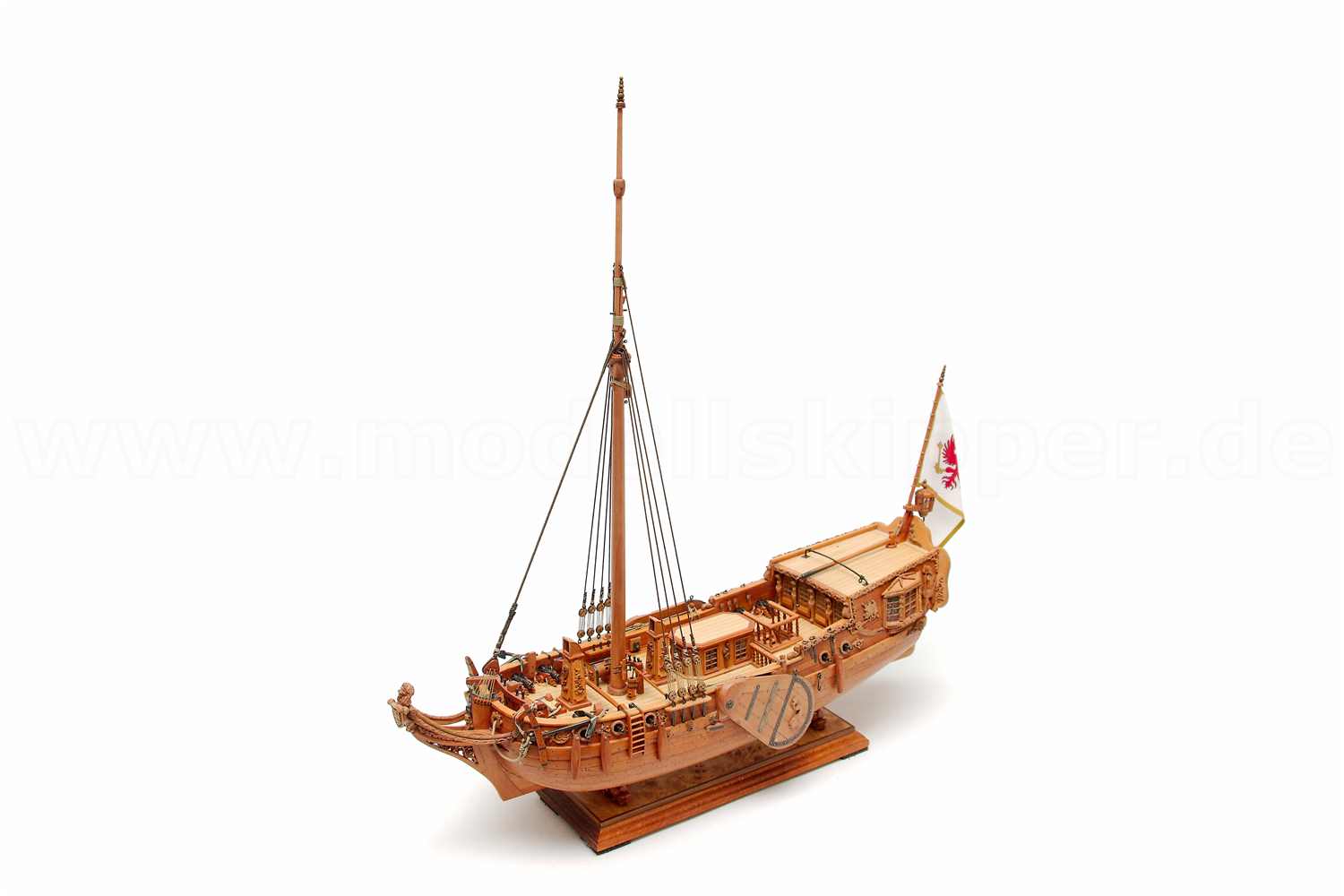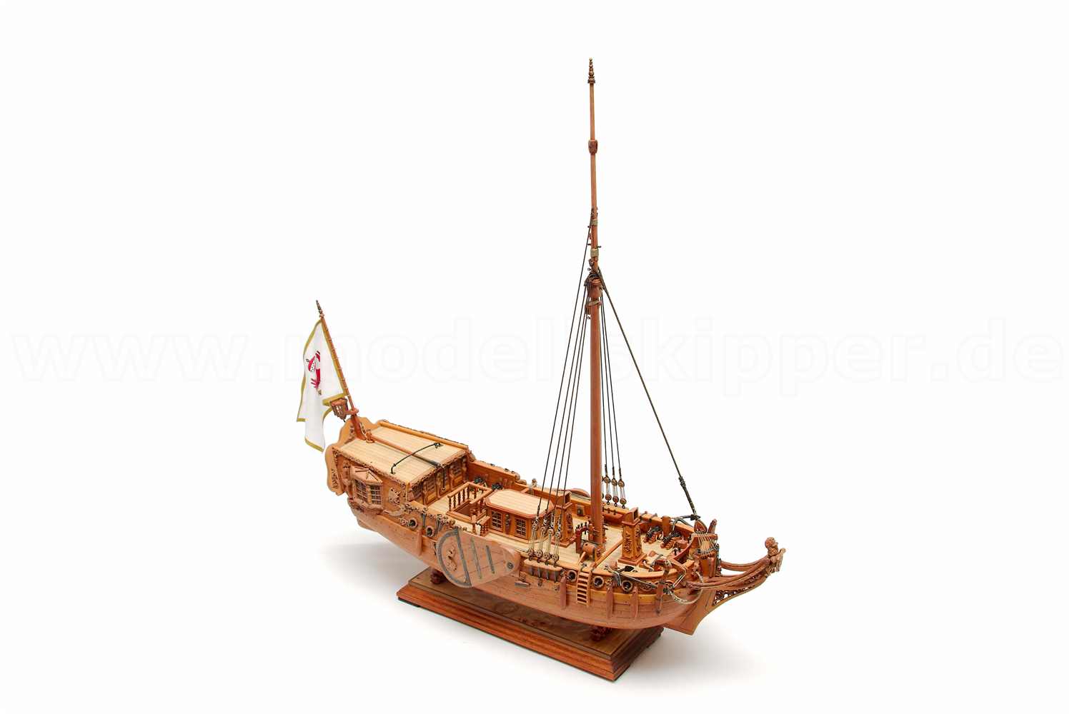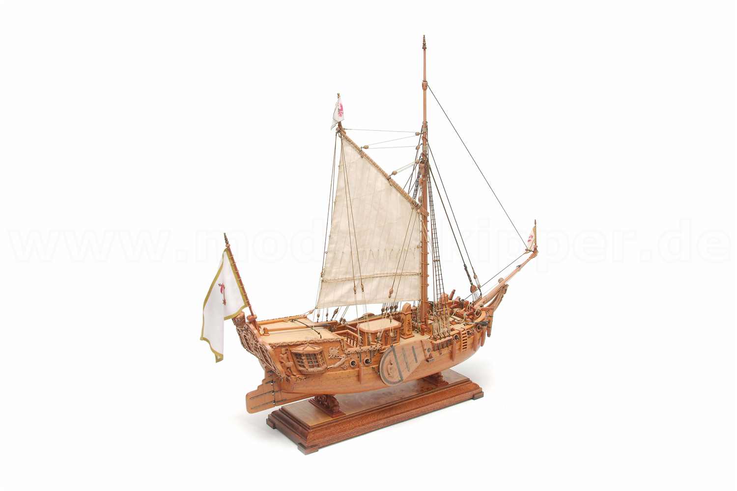 734 Std.: mit Setzen der "großen Flagge ", einem neuen Ständerbrettchen, fertigen Kanonen und Laterne sind die Detailarbeiten am Rumpf abgeschlossen