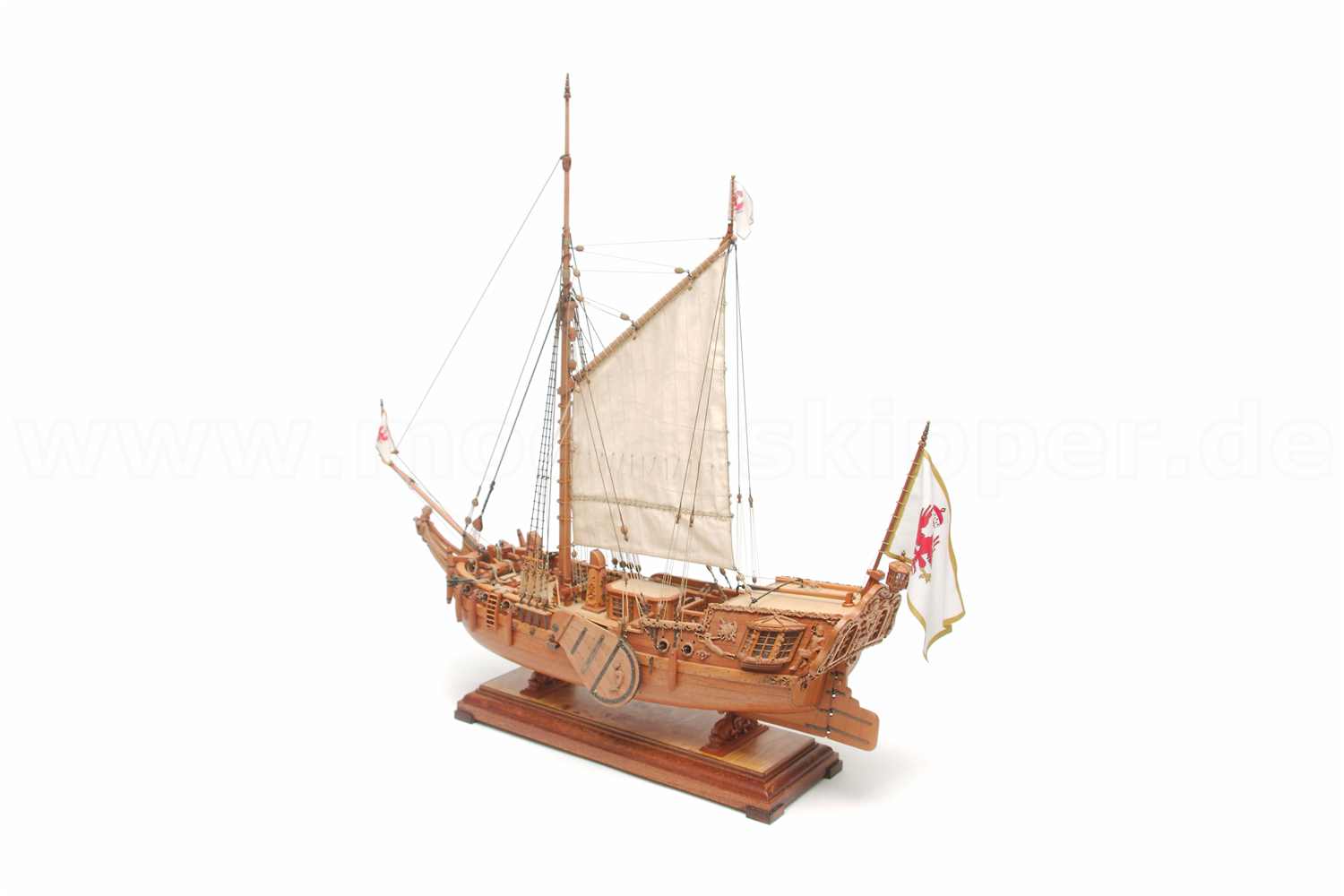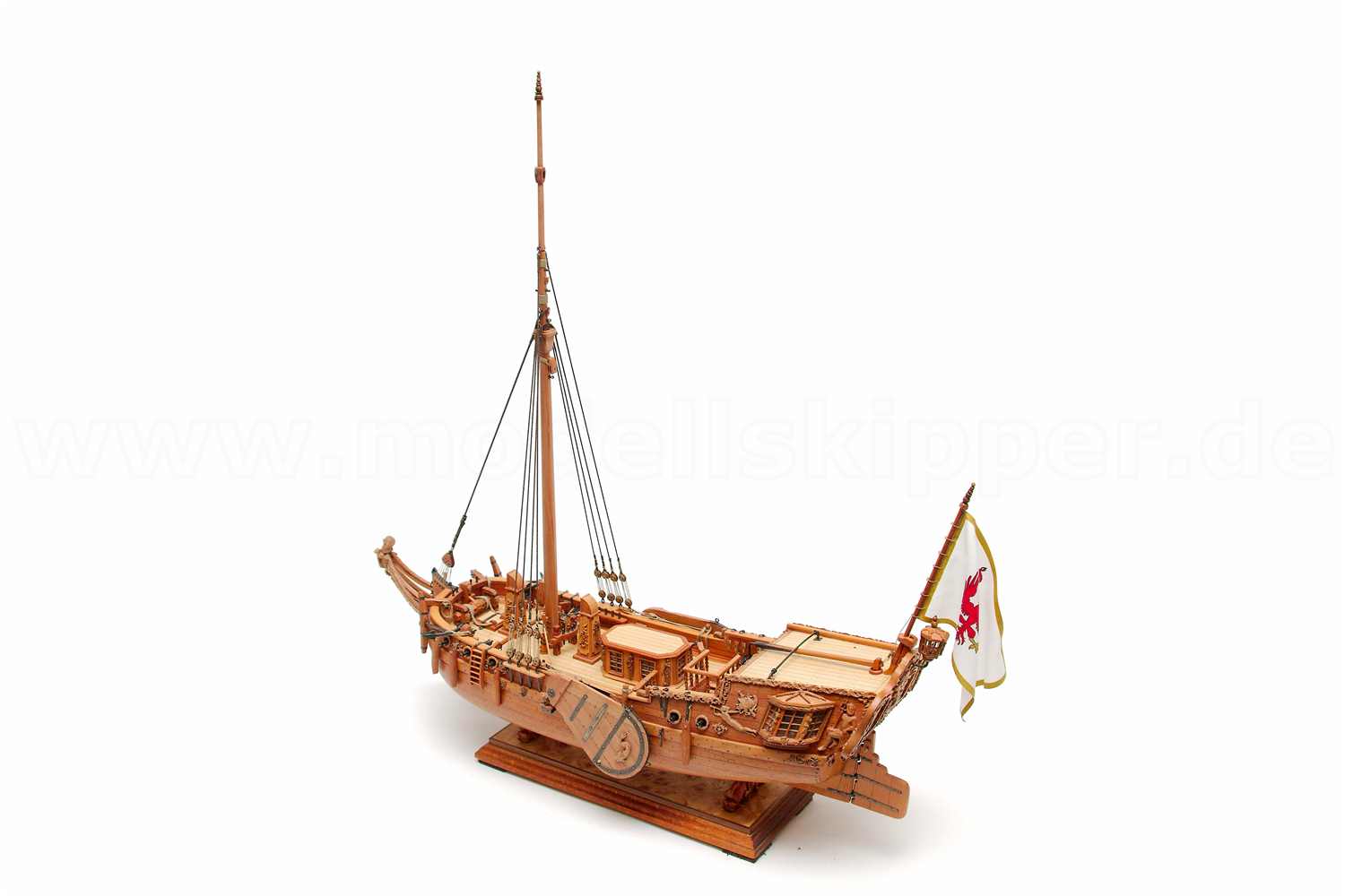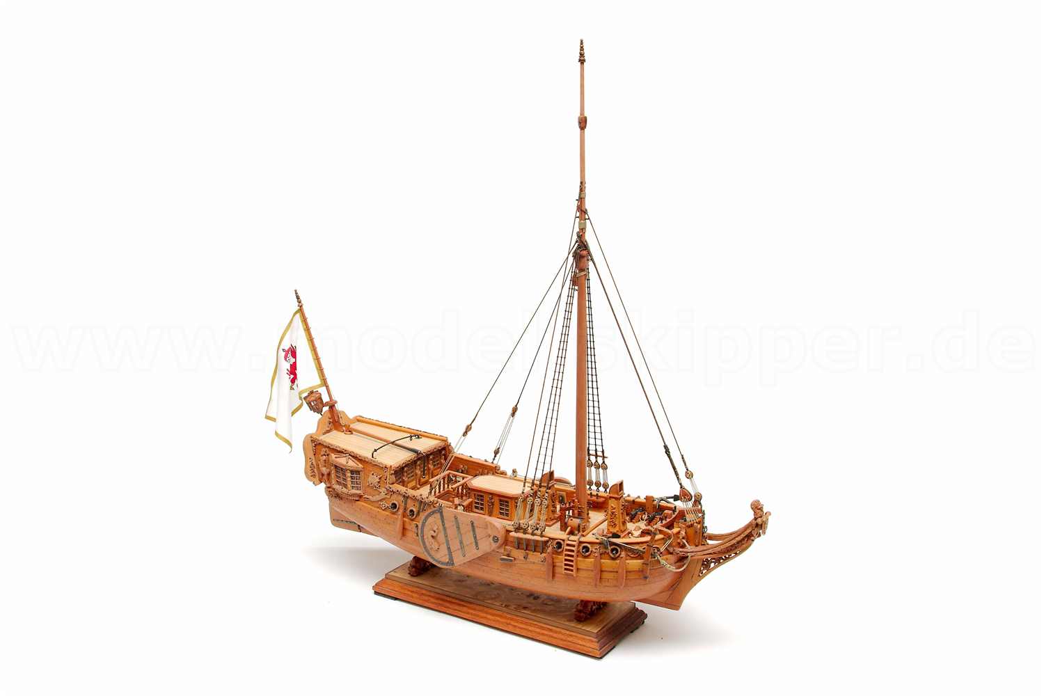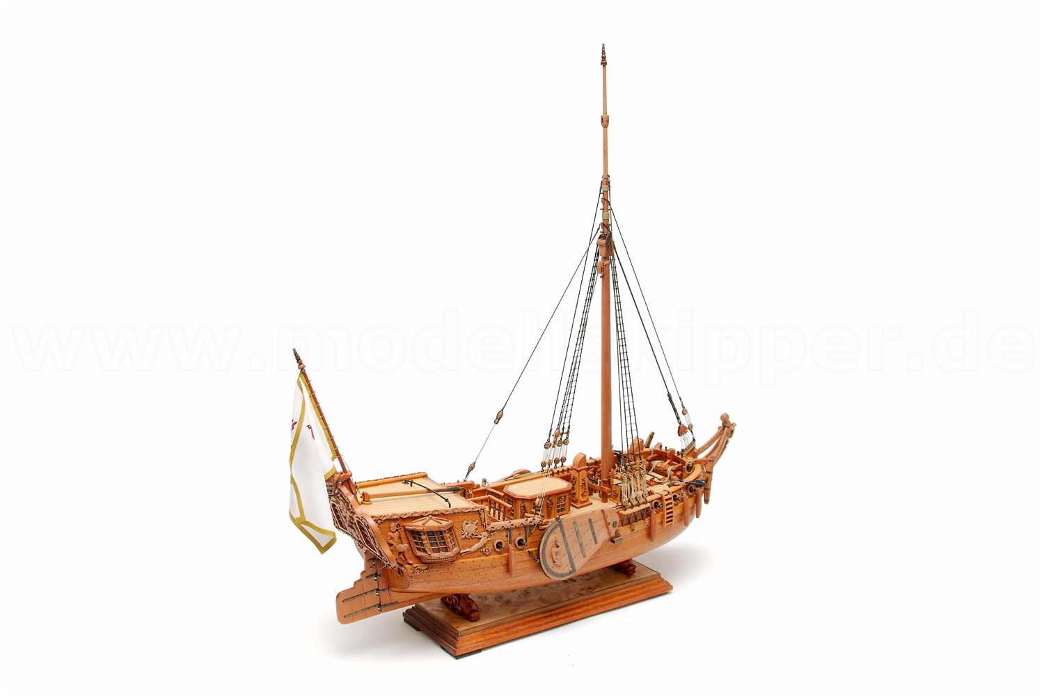 734 Std.: mit Setzen der "großen Flagge ", einem neuen Ständerbrettchen, fertigen Kanonen und Laterne sind die Detailarbeiten am Rumpf abgeschlossen