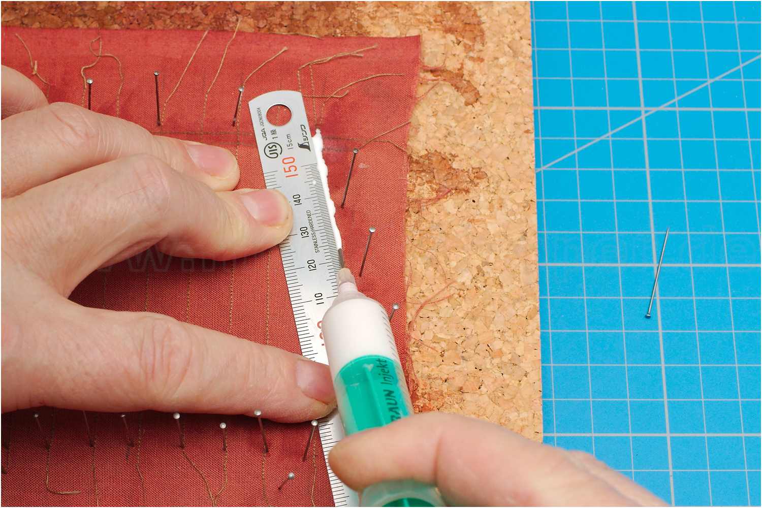 Mit Hilfe eines Stahllineals und einer Einwegspritze, in die ich verdünnten Holzleim gefüllt habe, versiegle ich die Außenkanten des Segels, sodass sie nicht ausfransen können.