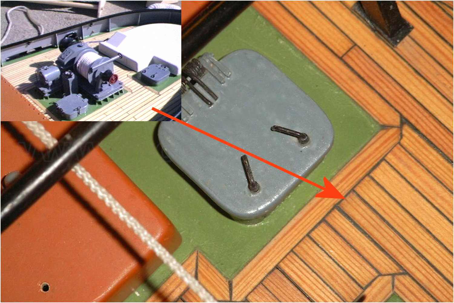 Ein aufgesetztes Arbeitsdeck aus Eiche, passend für Schlepper oder andere Arbeitsschiffe. Nicht schön, jedoch effektiv und eine große Herausforderung, so etwas im Maßstab nachzubilden, wie auch ein dunkles Deck auf einem Segler.