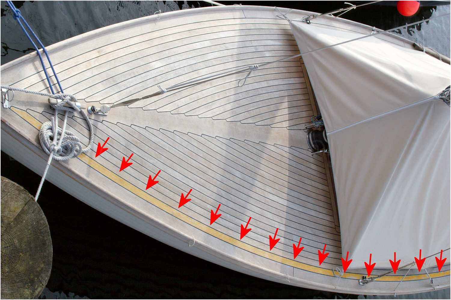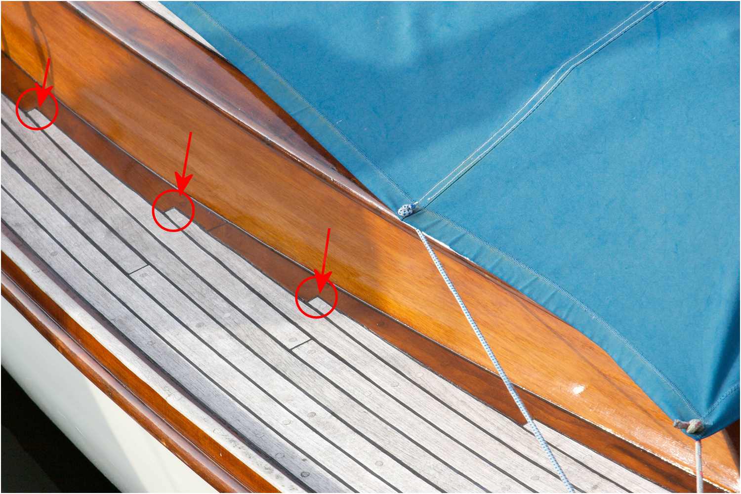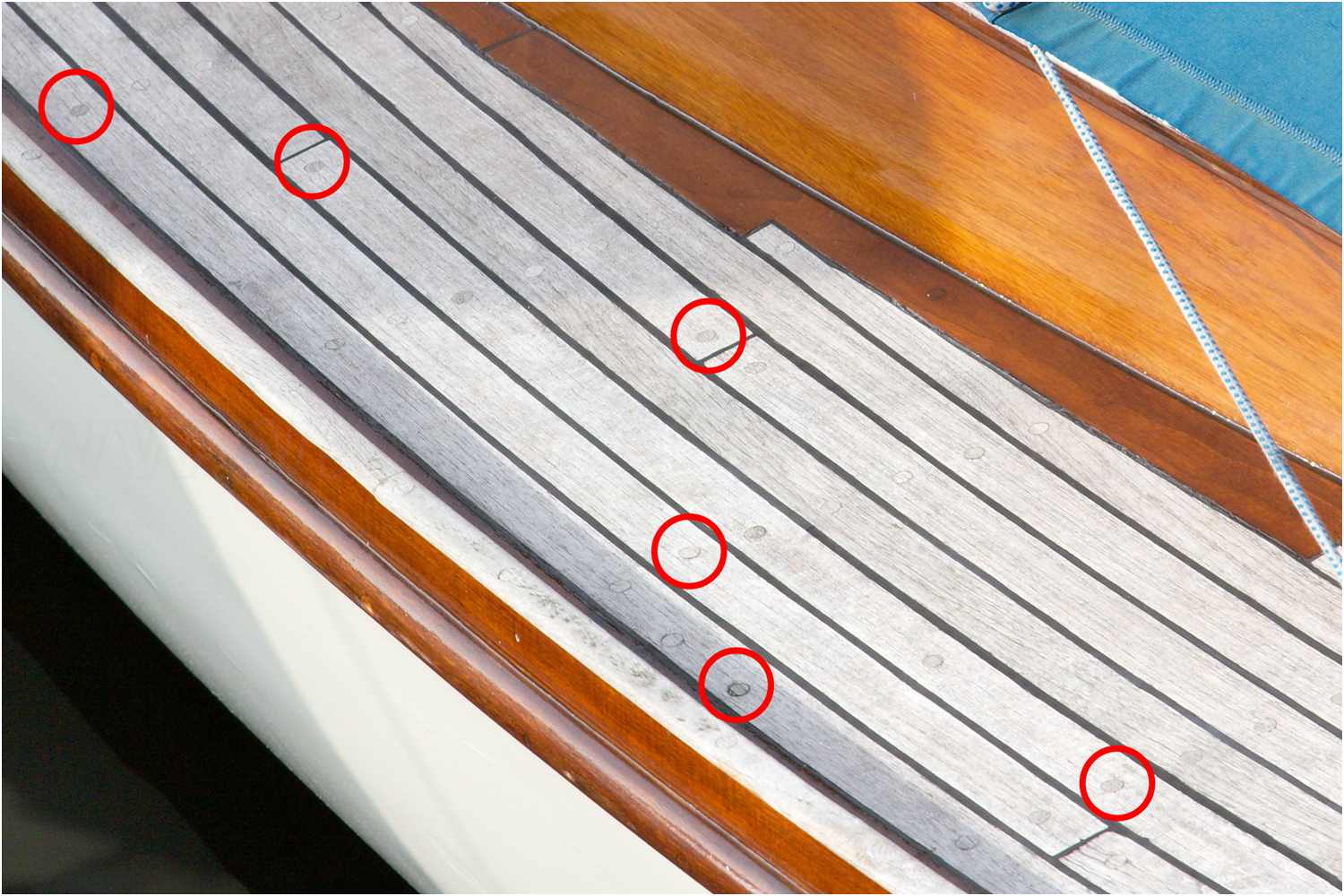 Oft sieht man die Nagelung gar nicht. Bei Yachten ist die verdeckte Nagelung sehr weit verbreitet. Hierbei werden die Planken durch horizontale Nägel miteinander verbunden und durch schräge Nägel von der Seite der Planken an den Decksbalken befestigt.