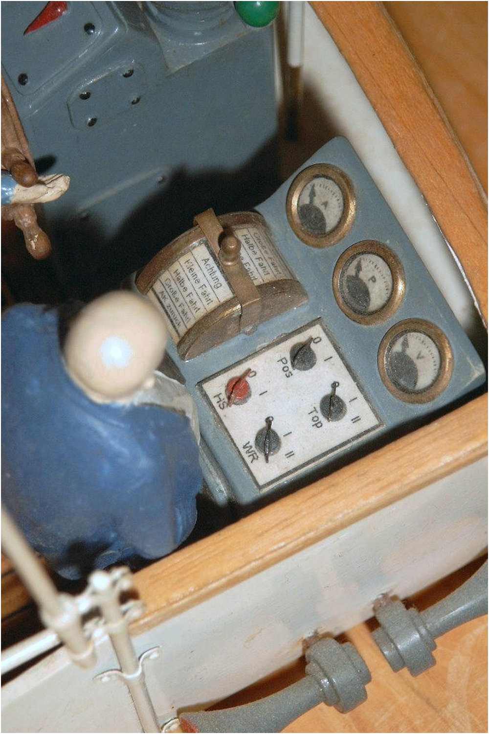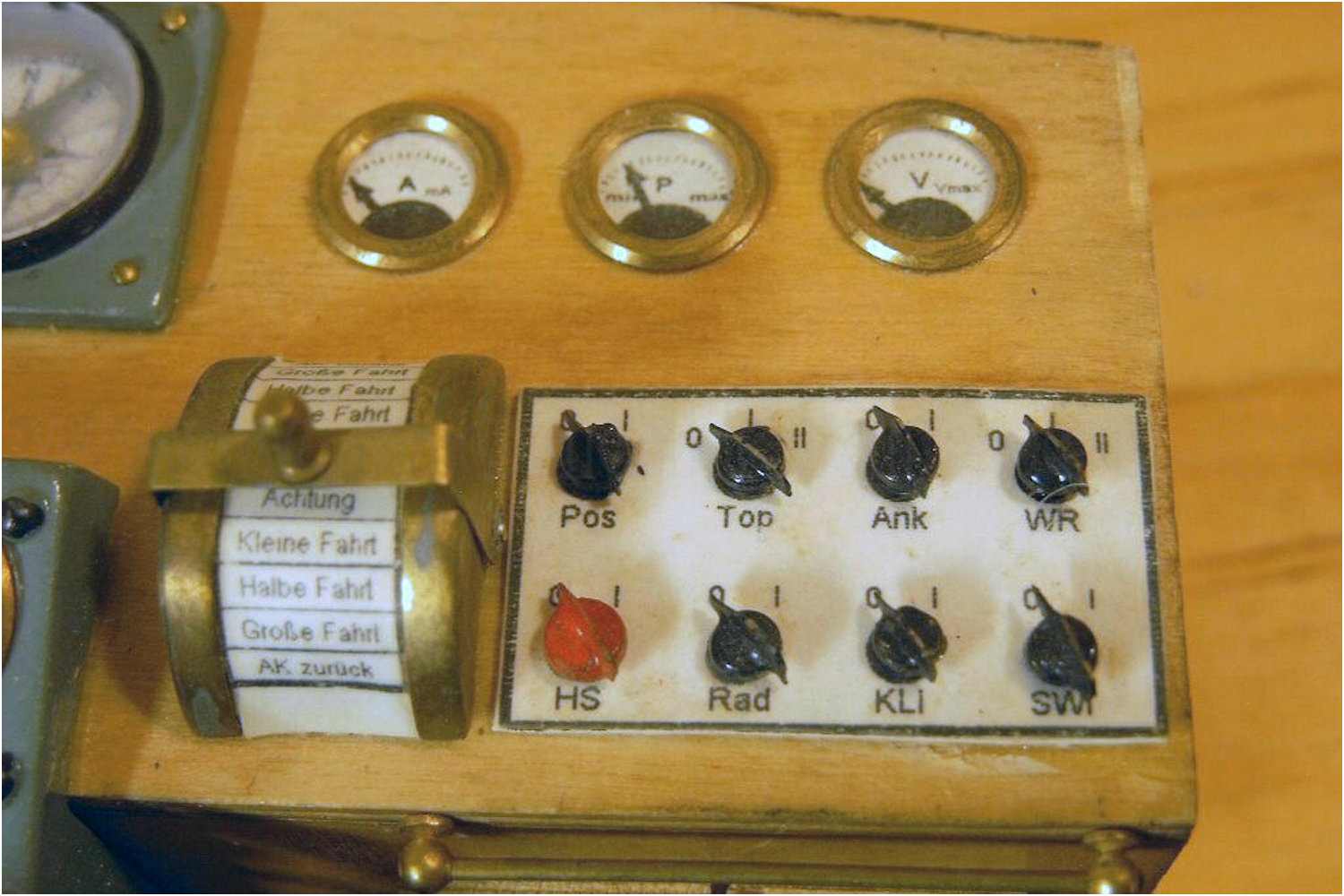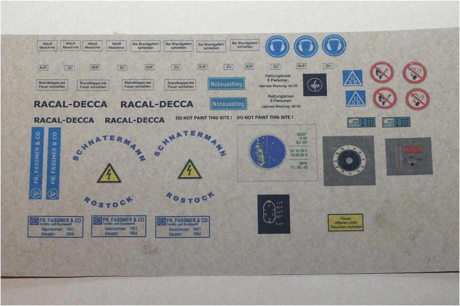 Hier ein Beispiel einer beschrifteten Schalttafel, Fahrtgeber und verschiedene Anzeigeinstrumente. Schrifthöhe 1-2 mm.