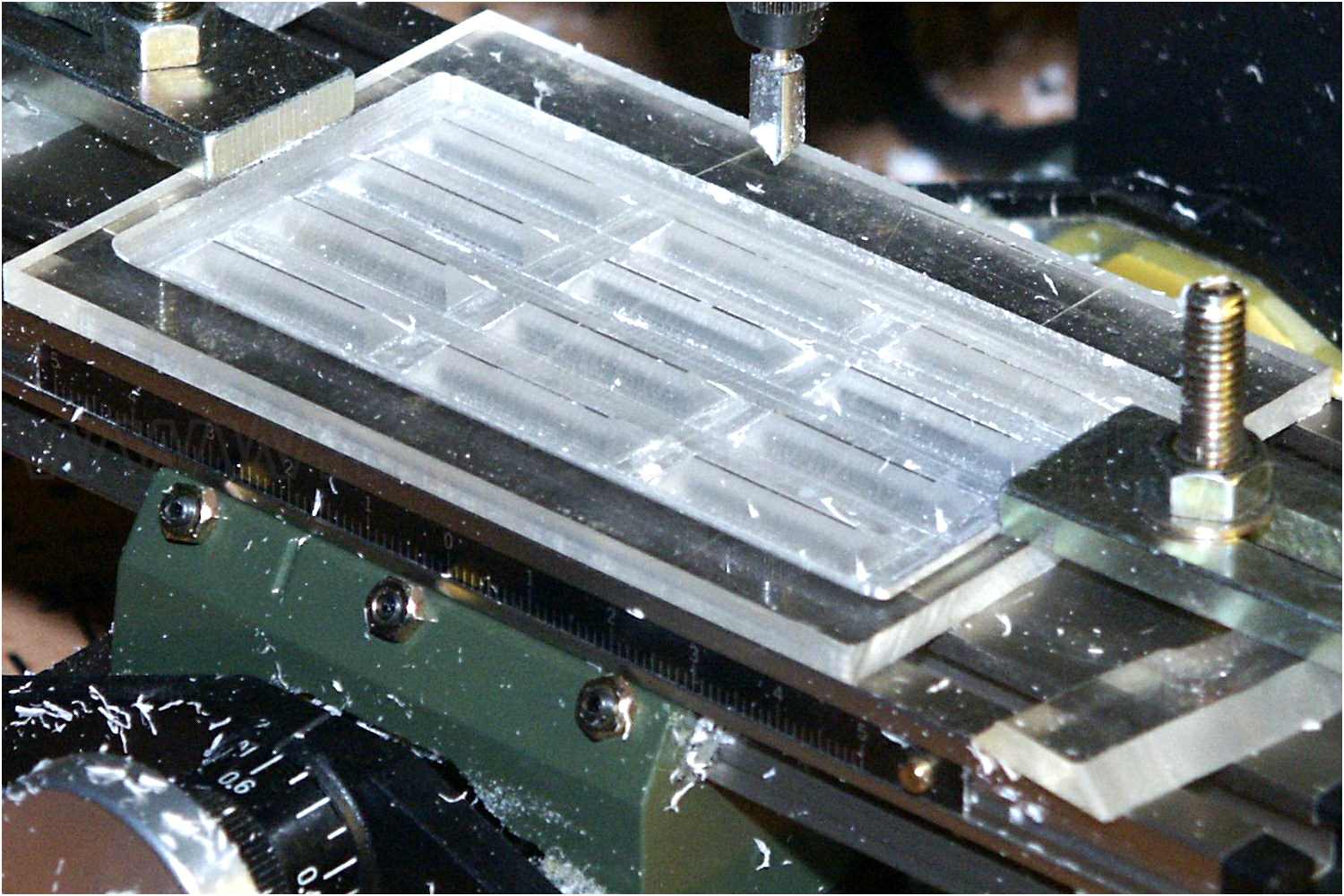 Hier auf dem Bild zu sehen, werden als Erstes die Rohlinge ausgefräst. Die Abstände zwischen den einzelnen Rohlingen wurden so gewählt, dass ich gleichzeitig einen kleinen Sockel erhalte, wie man später noch sehen wird.