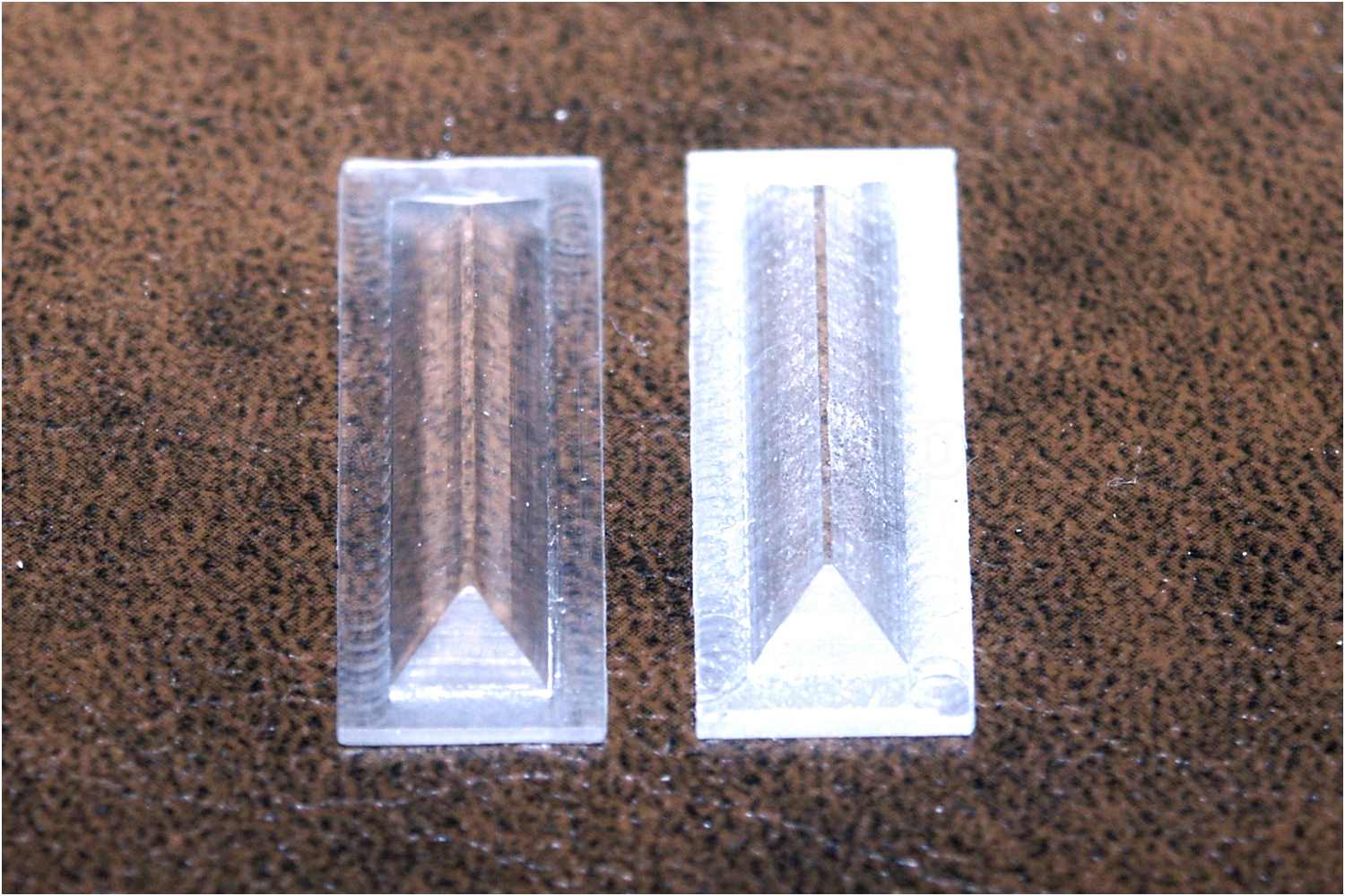 Wie man auf dem rechten Teil deutlich erkennt, wurde das Prisma nicht ganz spitz gefräst. Es entsteht so während des Polierens eine leicht abgerundete Stelle, also alles so beabsichtigt.