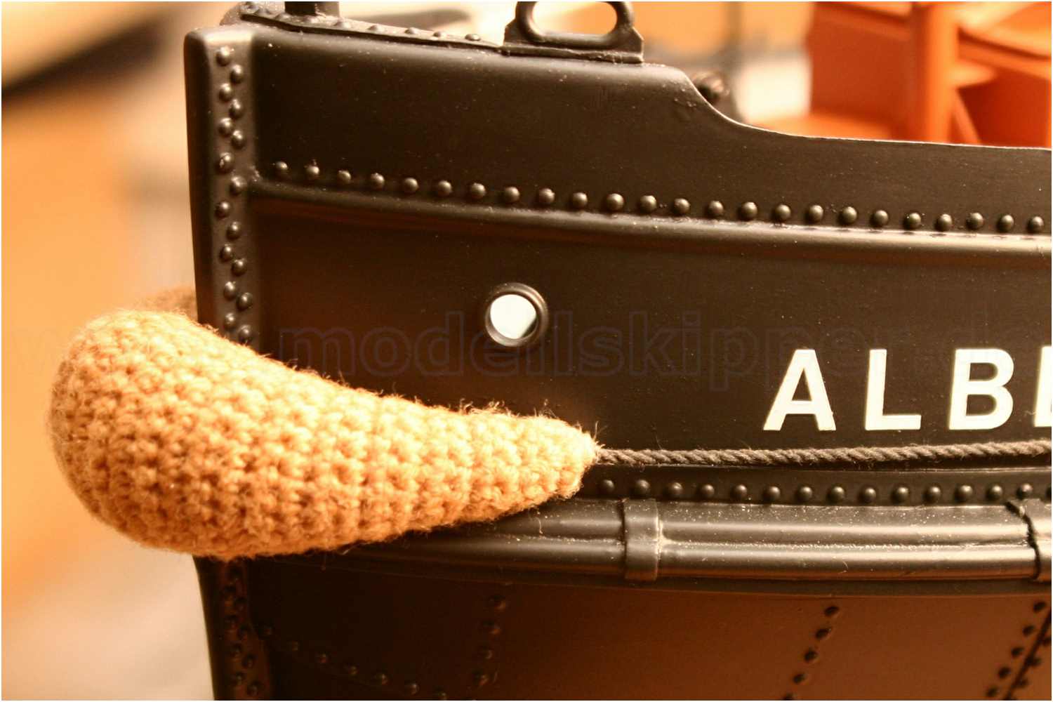 Das Haltetau habe ich aus schwarzem Polyesterzwirn nach Maß angefertigt und wie beim Original durch den Fender durch gefädelt. Dazu ein Ende des Seils mit Sekundenkleber in ein dünnes Messingrohr kleben und die Gegenseite leicht spitz feilen. So gestaltet durch sich das Durchfädeln recht problemlos.
