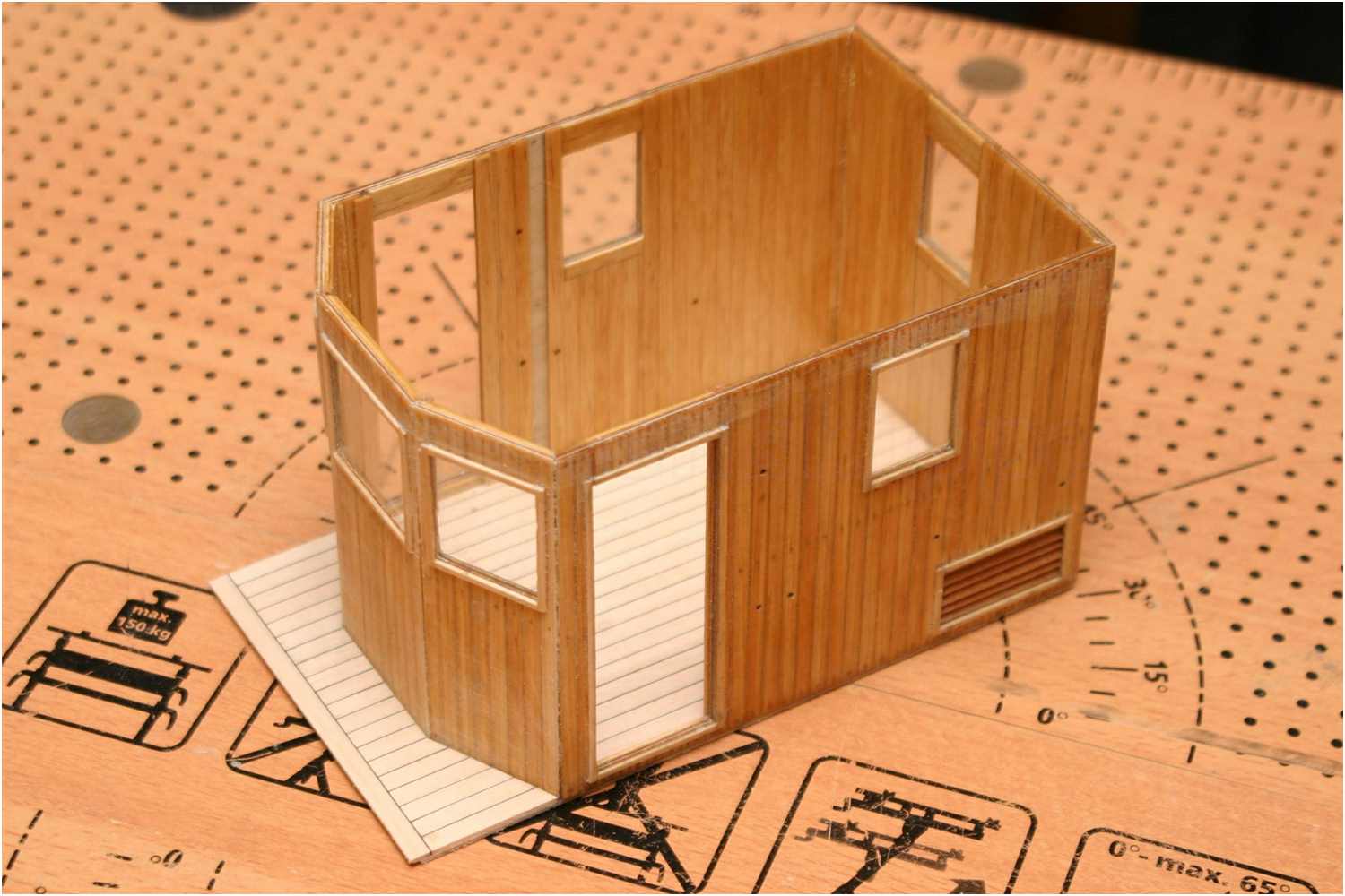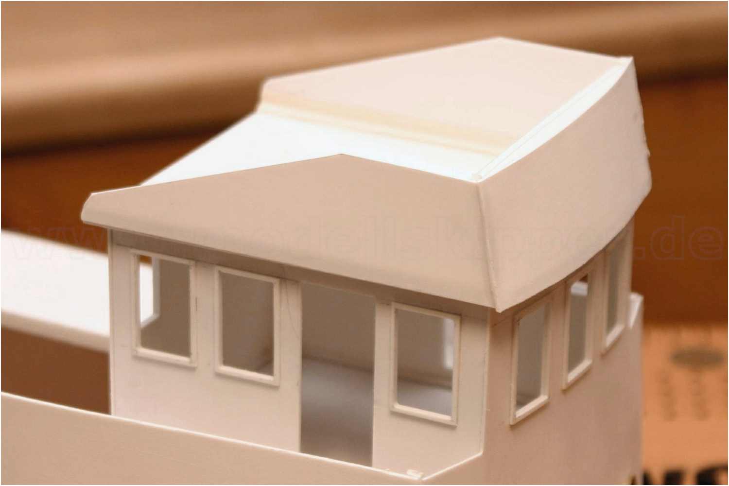 Hier am Beispiel des Deckshauses eines Fischkutters, bei der in ähnlicher Weise verfahren wurde, ohne und mit Fensterrahmen.