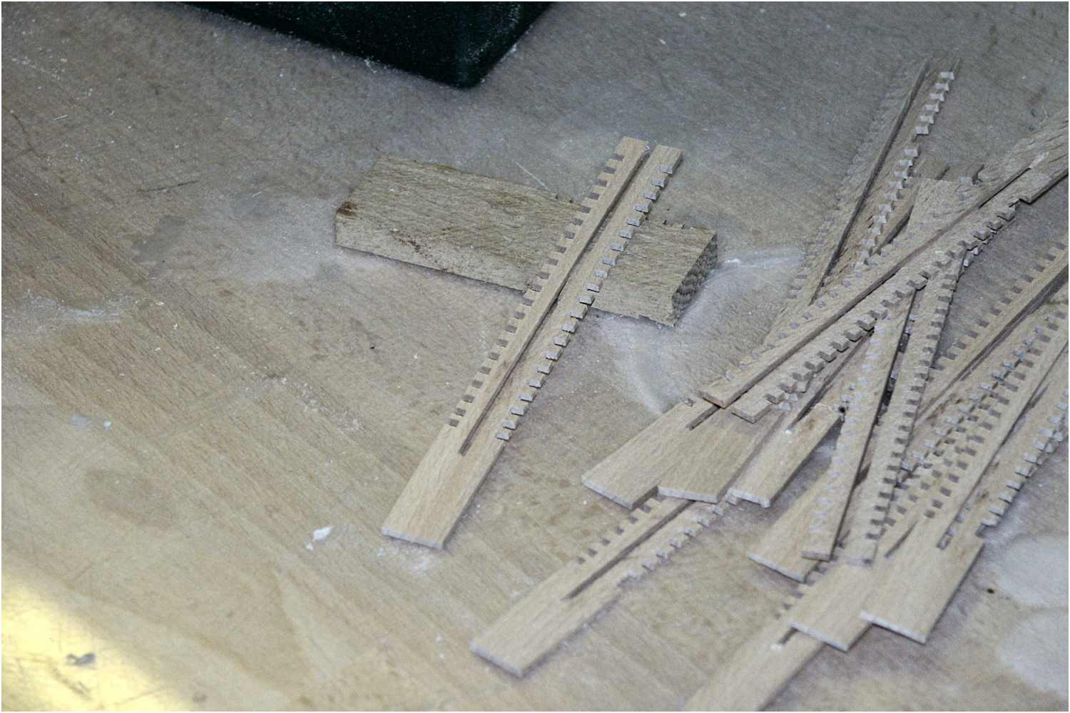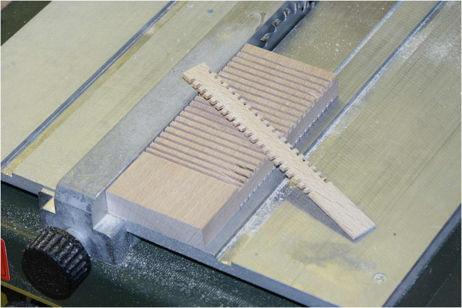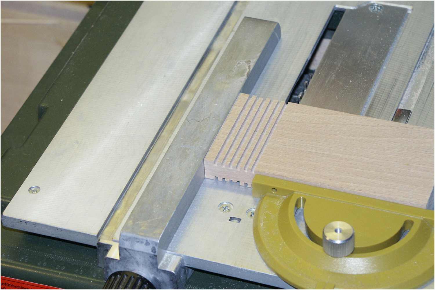 Diese Art der Herstellung geht recht flott voran und das Ergebnis lässt sich durchaus präsentieren. Erhebt allerdings keinen Anspruch auf absolute hochpräzise Genauigkeit. Das Einstellen des Parallelanschlags sollte sehr sorgfältig vorgenommen werden, um einen exakten Abstand der Nuten zu erhalten. Alle Perfektionisten sollten dann doch lieber mit einer Fräse arbeiten.
