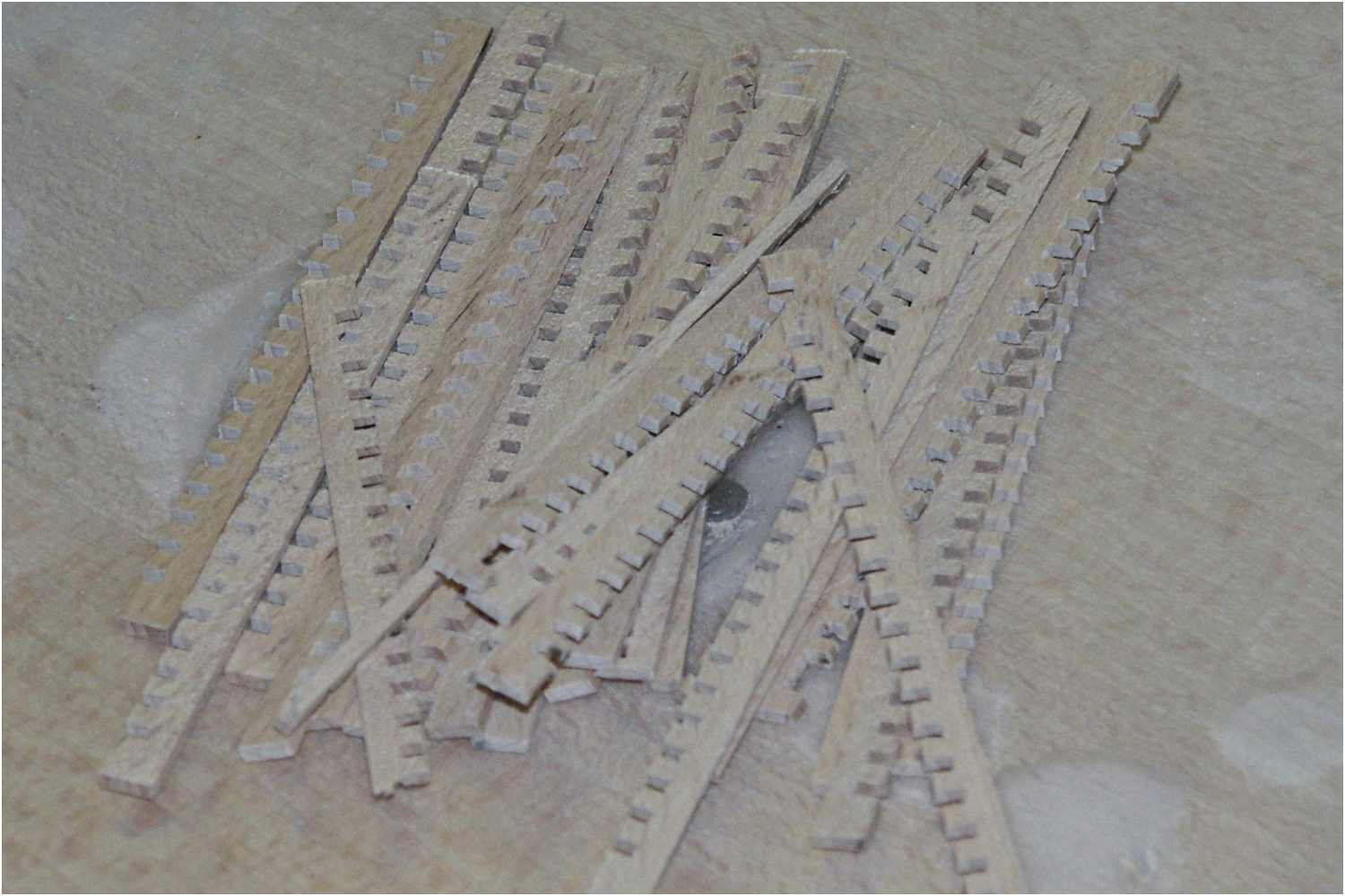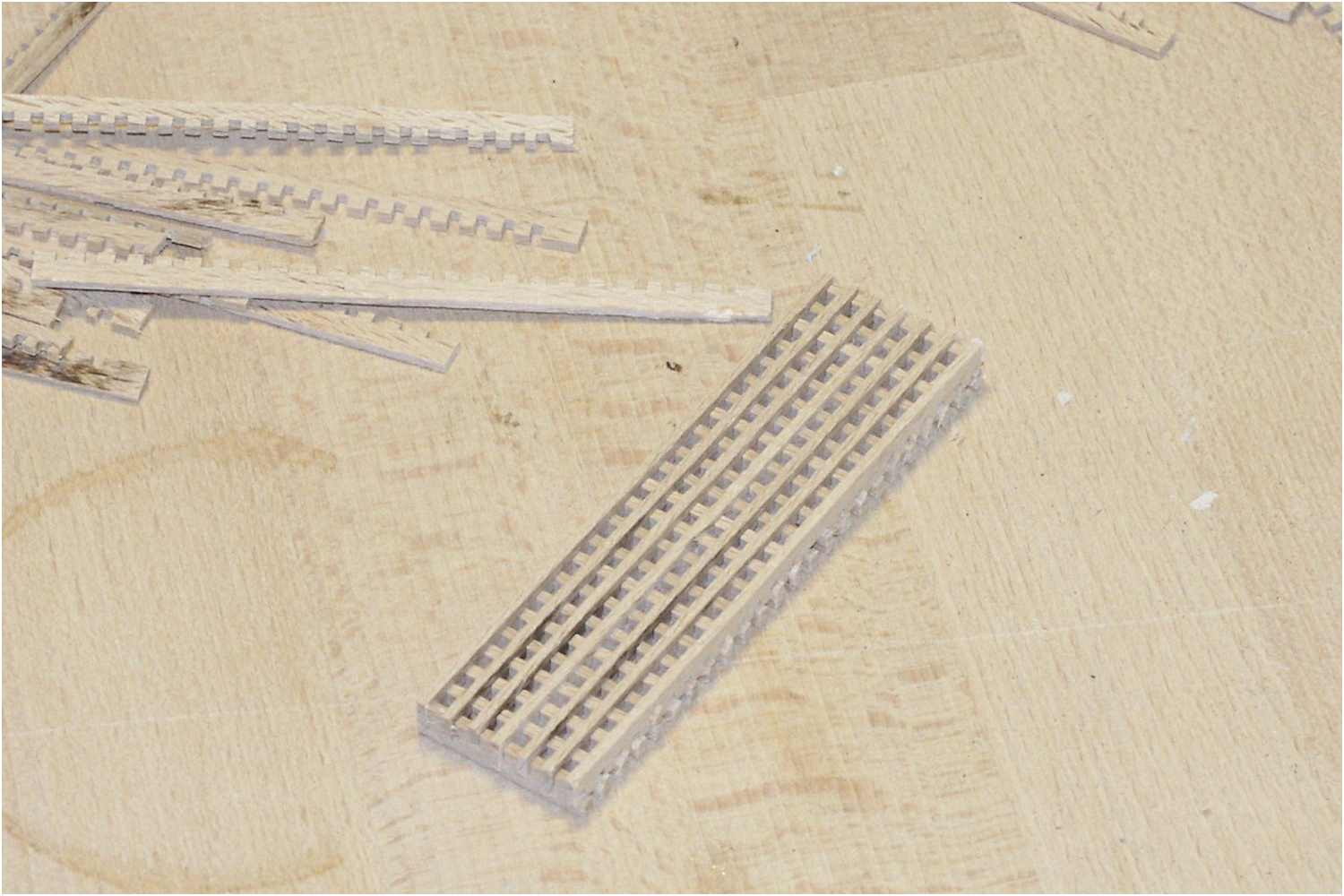 Es sollte möglichst eine harte Holzart verwendet werden, um saubere Schnittflächen zu erhalten. Bei meiner Variante kam Buchenholz zum Einsatz.