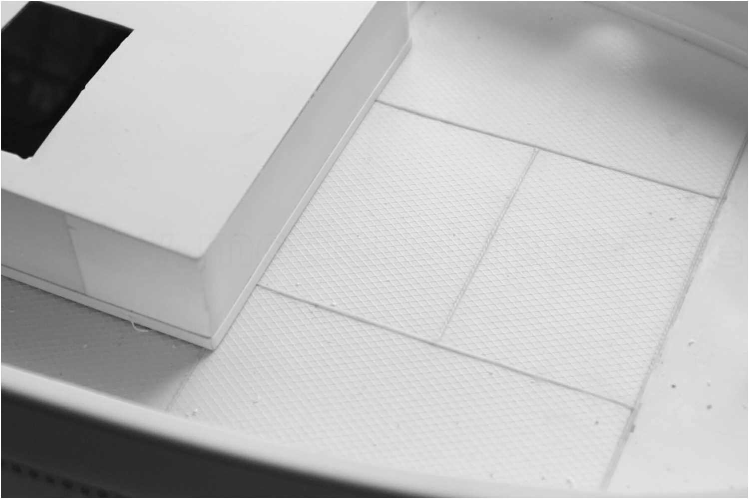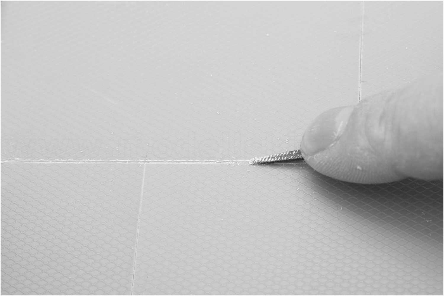 Die Verarbeitung gestaltete sich vollkommen unproblematisch. Ich hatte in diesem Fall das Rautenblech schon in entsprechende Plattenabschnitte zugeschnitten und auf das Deck aufgeklebt. Die Stoßkanten der Platten wurden noch einmal mit einer kleinen Dreikant-Schlüsselfeile nachgezogen und etwas vertieft. In diese Nut verklebt ich dann die Zwirnsfäden. Ich fixierte erst ein Ende des Fadens an einem Ende der Nut mit Sekundenkleber. So konnte ich den Faden unter leichter Spannung genau gerade in die Nut legen und vorsichtig mit dünnflüssigem Sekundenkleber tränken. Kurz noch einmal mit der gekrümmten Pinzette fest in die Naht drücken und die Klebereste mit eine Putzlappen wegwischen. Fertig war eine schöne saubere Schweißnaht.