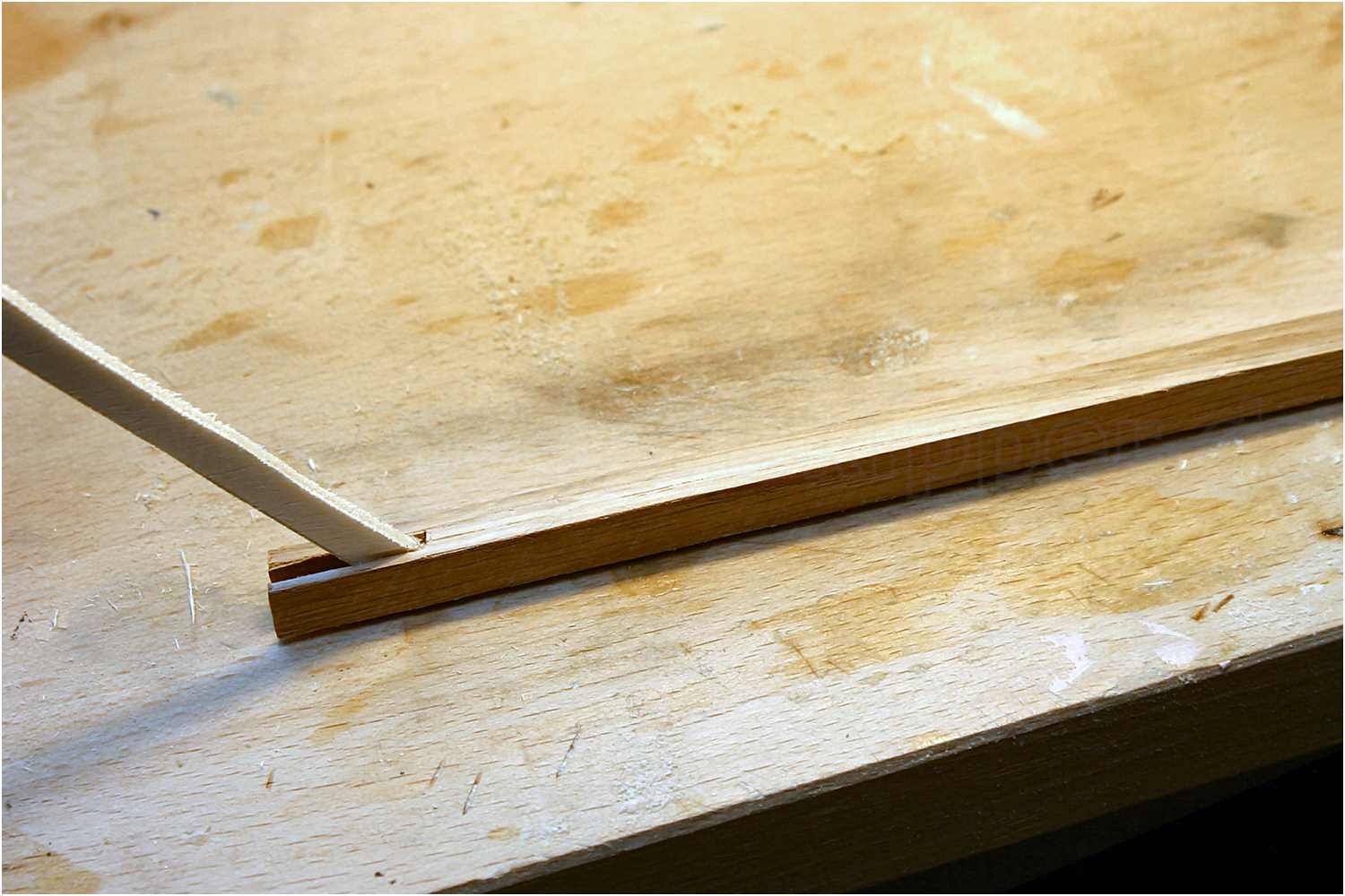 Eichenleisten mit eingefräster Nut für den Fuß- oder Bodenbalken (Leger) und die beiden unteren Spantbalken.