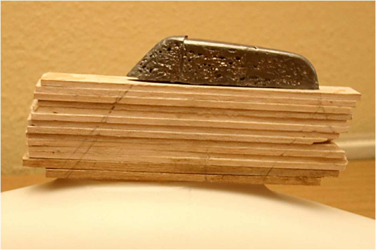 Ich hatte vorher Höhe des geborgten Originalkiels ausgemessen und die Bleibombe gleich etwa 2,5 cm tiefer gesetzt, um somit einen etwas tiefer liegende Schwerpunkt zu erhalten.