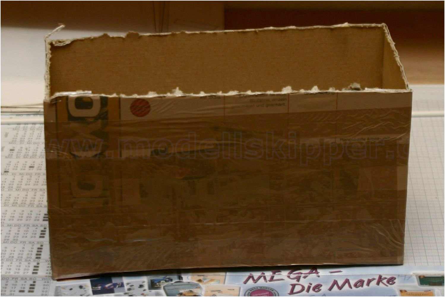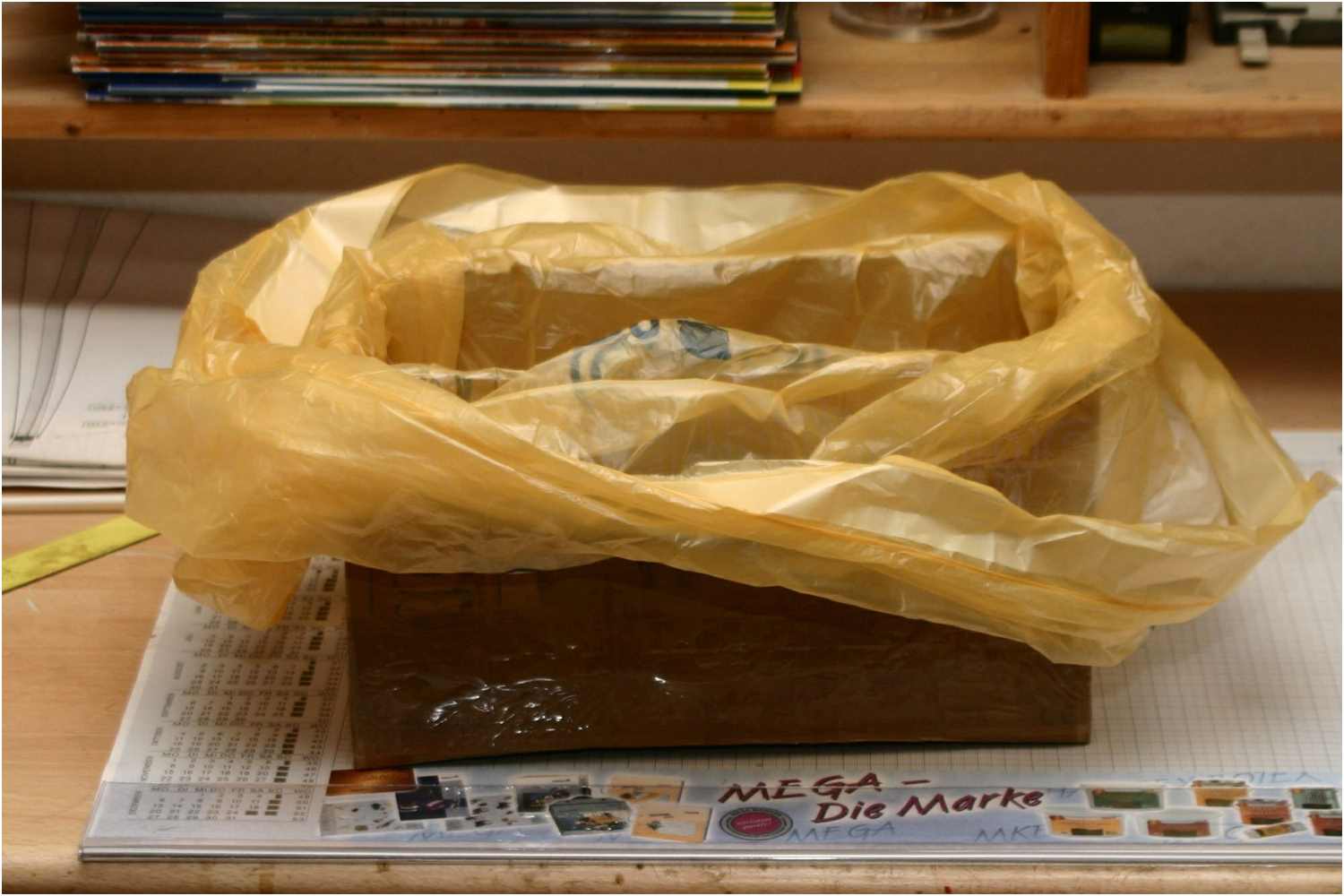 In einem alten Karton wurde eine Mülltüte eingelegt, der Kiel wurde mit Trennmittel (Vaseline) eingestrichen und kopfüber in den Karton gestellt.