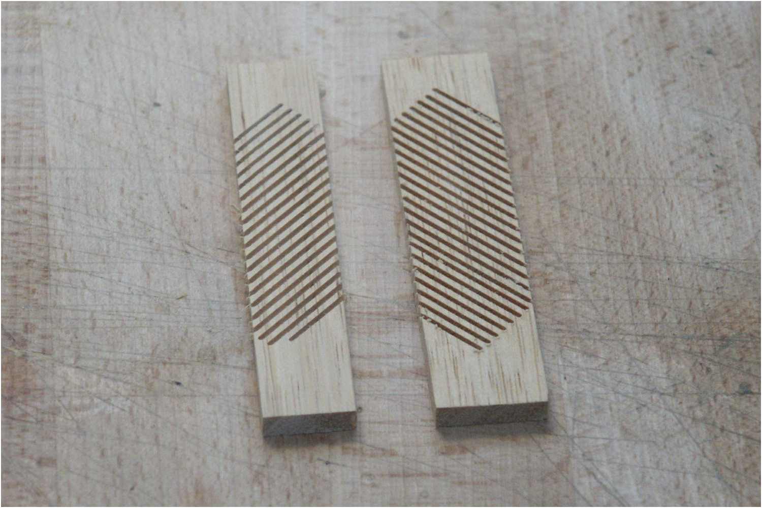 Zusätzlich werden die Lamellen aus 1 mm Ahornfurnier angefertigt. Man muss darauf achten, dass die Lamellen breiter sein müssen als die Nut lang ist, da diese über den Rahmen hinausschauen.