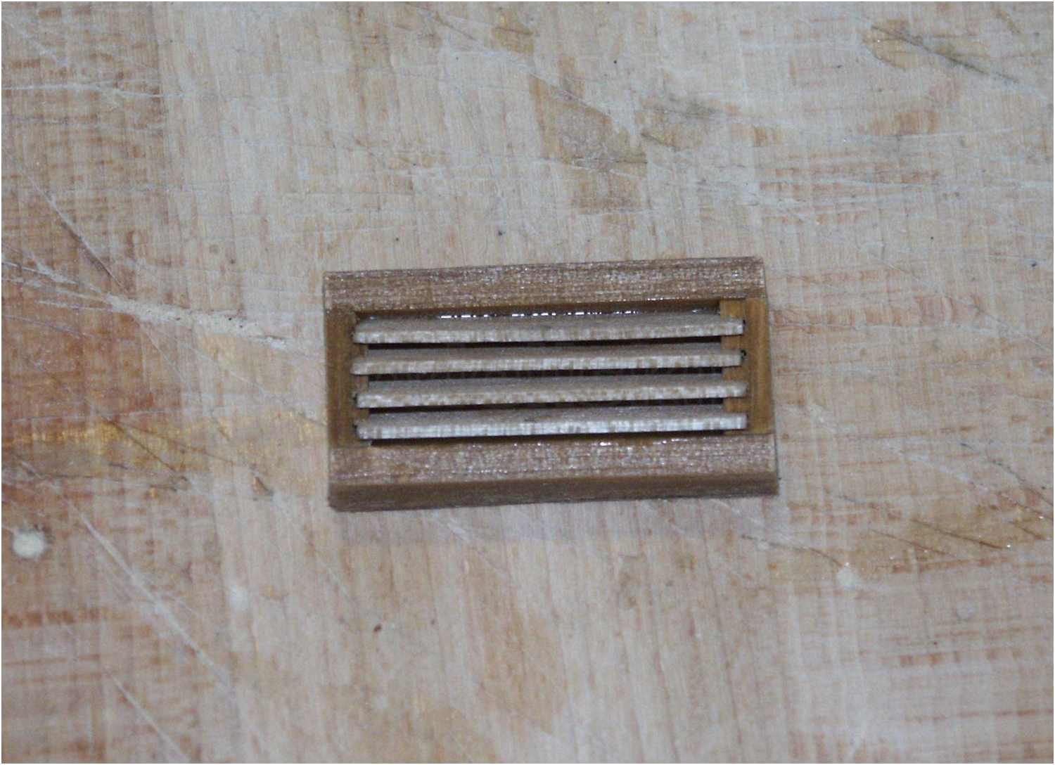 Die Jalousiestreifen werden aus Holzleisten angefertigt und zunächst in Gruppen zusammengeklebt. Dabei darauf achten, dass die Unterseite vorn etwas angeschrägt wird, sodass ein kleiner Spalt entsteht.