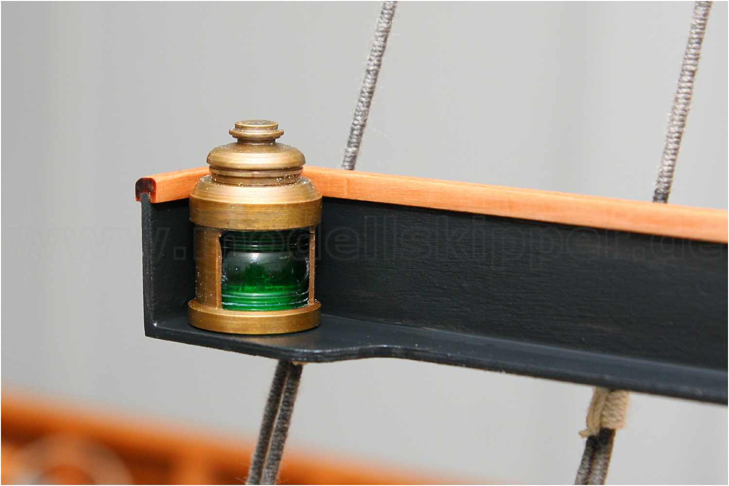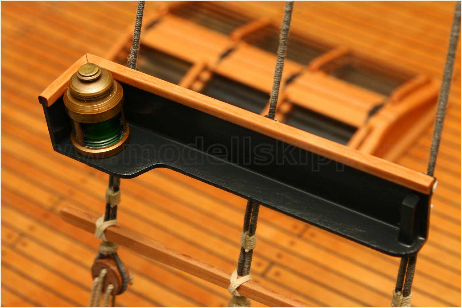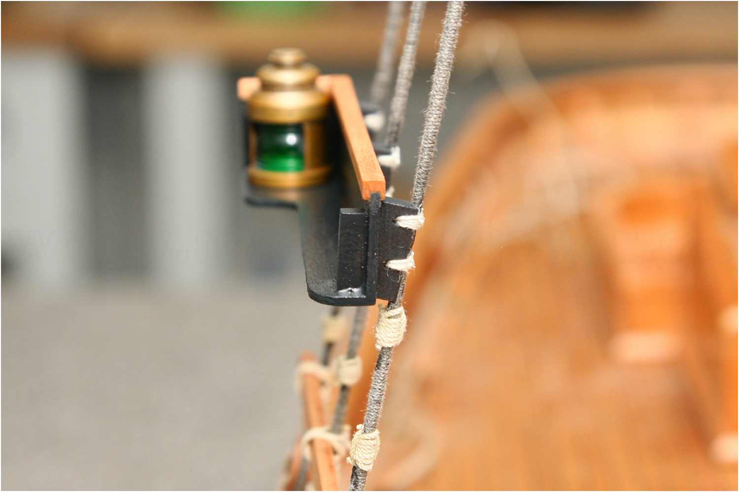 Damit Positionslampen an Wanten aufrecht stehen, muss die Neigung der Seile ausgeglichen werden. Dazu werden auf der Hinterseite des Lampenbords abgeschrägte Distanzhölzer befestigt. Mit einer Keep versehen, können sie sich bündig an die Wanten anschmiegen.