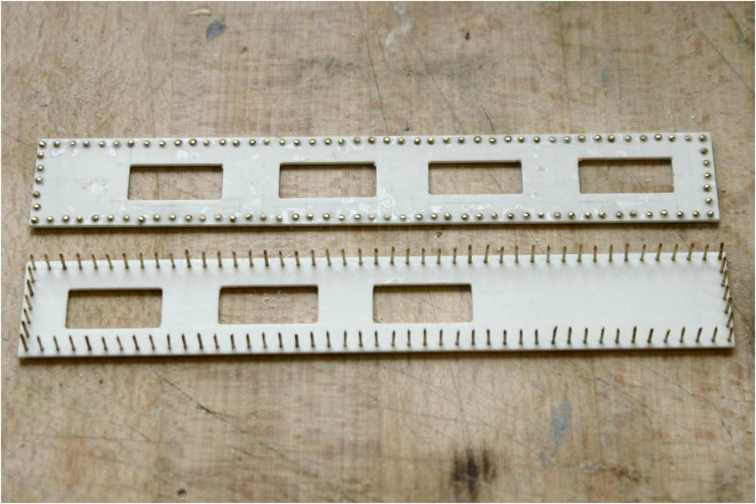 Hier zum Vergleich zwei unterschiedliche Bauteile. Auf dem Oberen ist gut das Problem der nicht ganz mittig positionierten Nagelschäfte zu erkennen. Die Nietreihe wirkt ungleichmäßig und natürlich viel zu überdimensioniert.