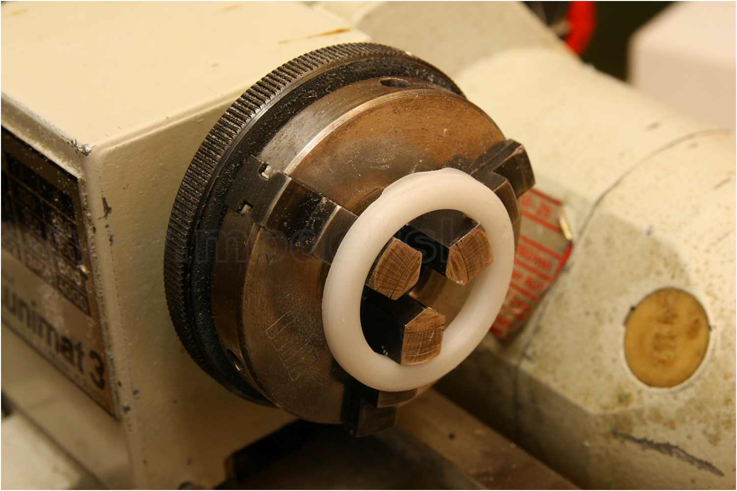 Aus der Materialkiste habe ich mir ein Stück POM herausgesucht. Ein Kunststoff, der sich auf Grund seiner Materialbeschaffenheit sehr gut drehen und schleifen lässt. Selbst auf kleinen, nicht so leistungsstarken Drehmaschinen lässt sich eine "guter" Span abheben, sodass Drehteile recht schnell gefertigt sind.
