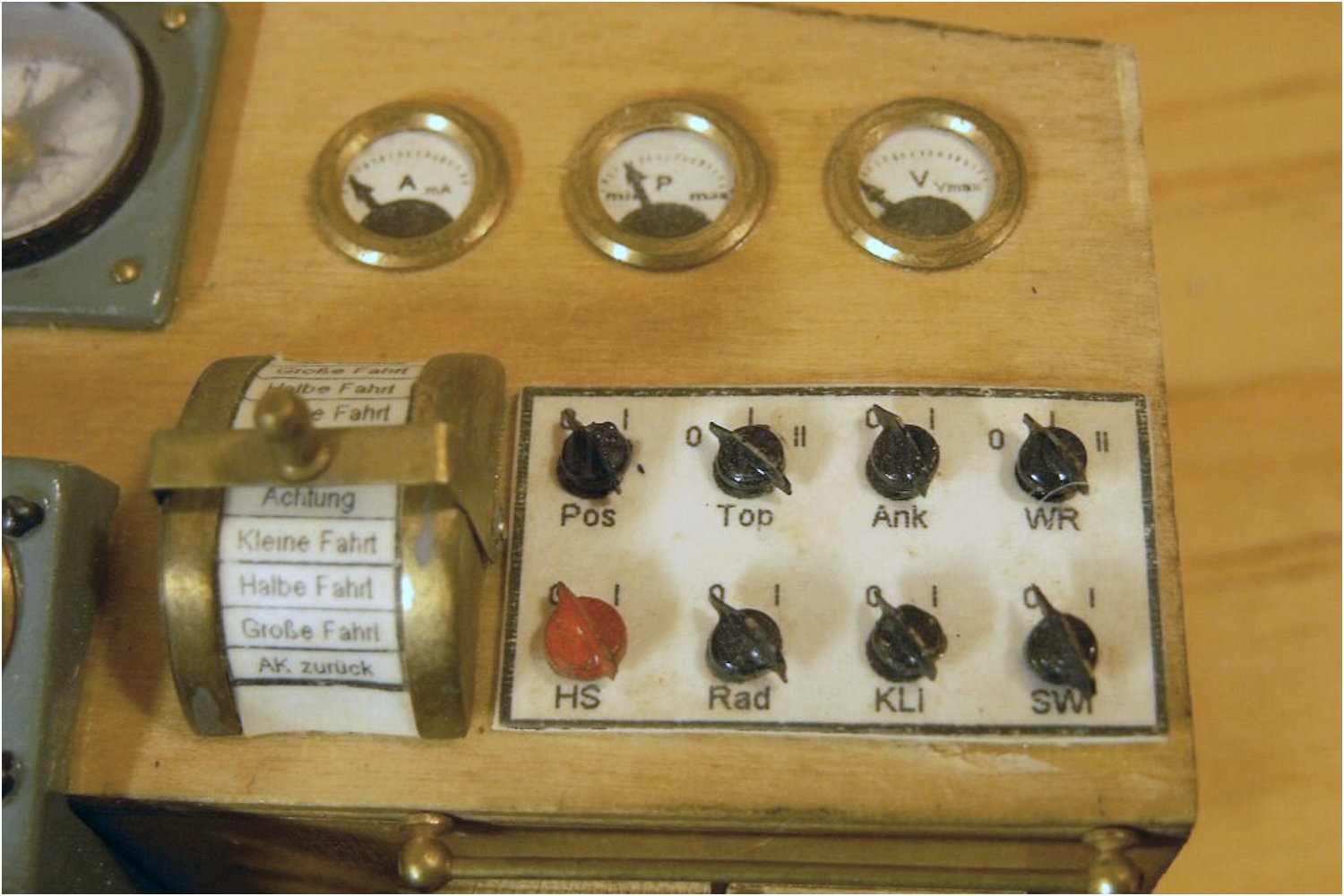 Man beachte noch einmal die Form des oberen Schaltergehäuses. Durch die Verwendung der Holzkugel hat das Gehäuse eine leicht konische Form, die wesentlich realistischer aussieht, als eine einfache zylindrische Hülse.
