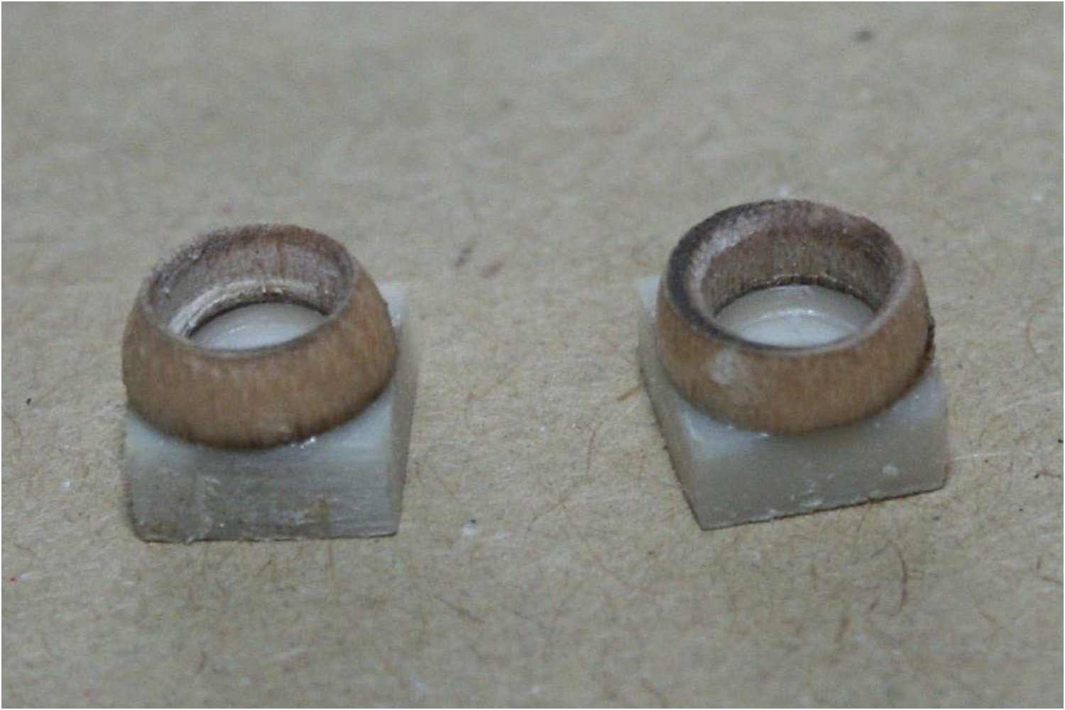 Die Holzperlen werden halbiert, einfach mittels der Minibohrmaschine und Schleifkörper abschleifen.