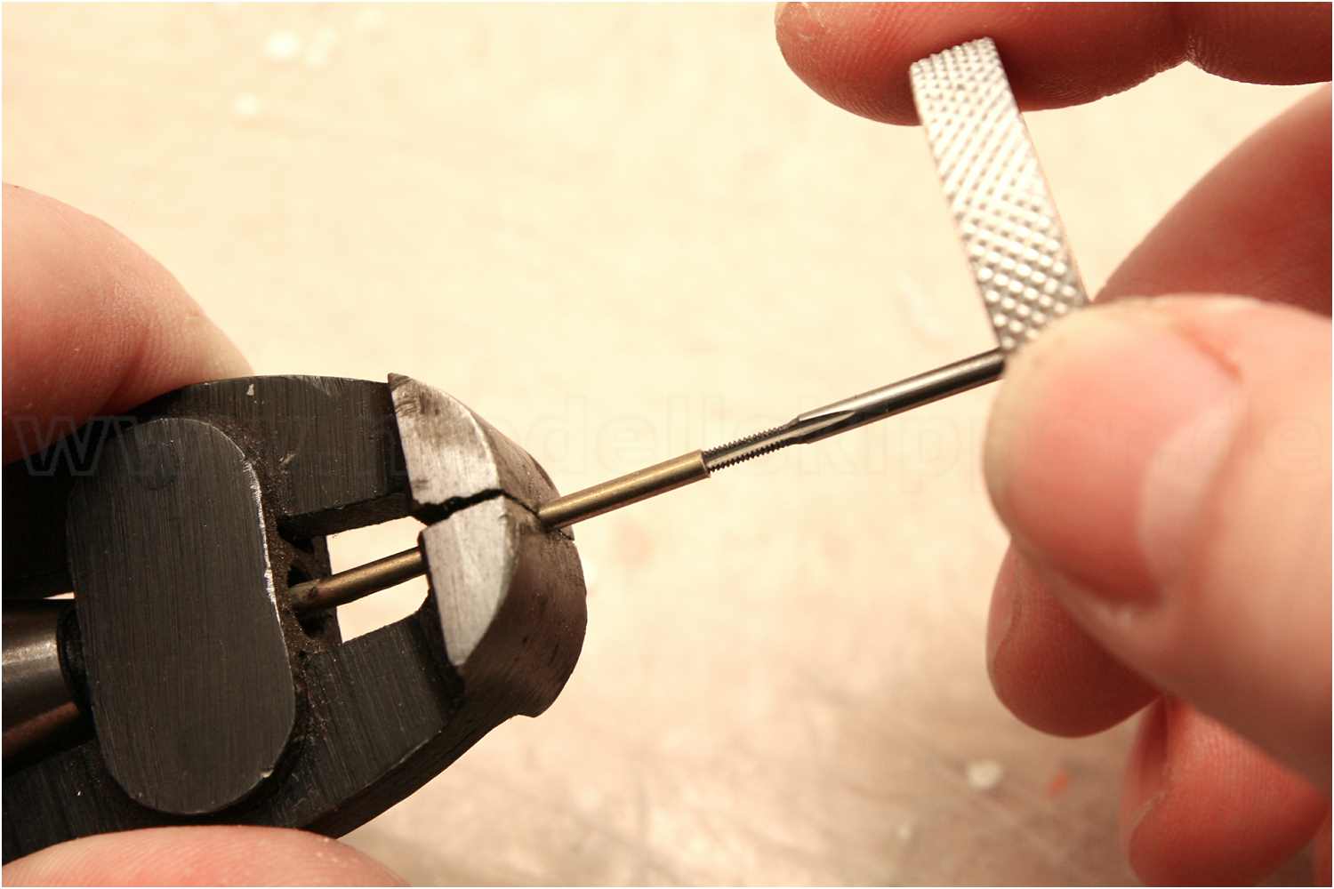 Dann schneidet man einfach in ein dünnes Messingröhrchen ein Gewinde, hier M1,6.