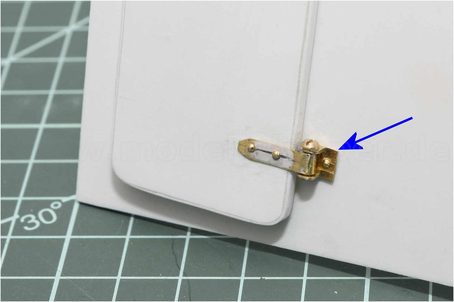 Problematisch wird es dann, wenn die Scharnierangel (blauer Pfeil) sehr filigran ausgelegt ist und kaum ausreichend Material für das Gewinde hat.
