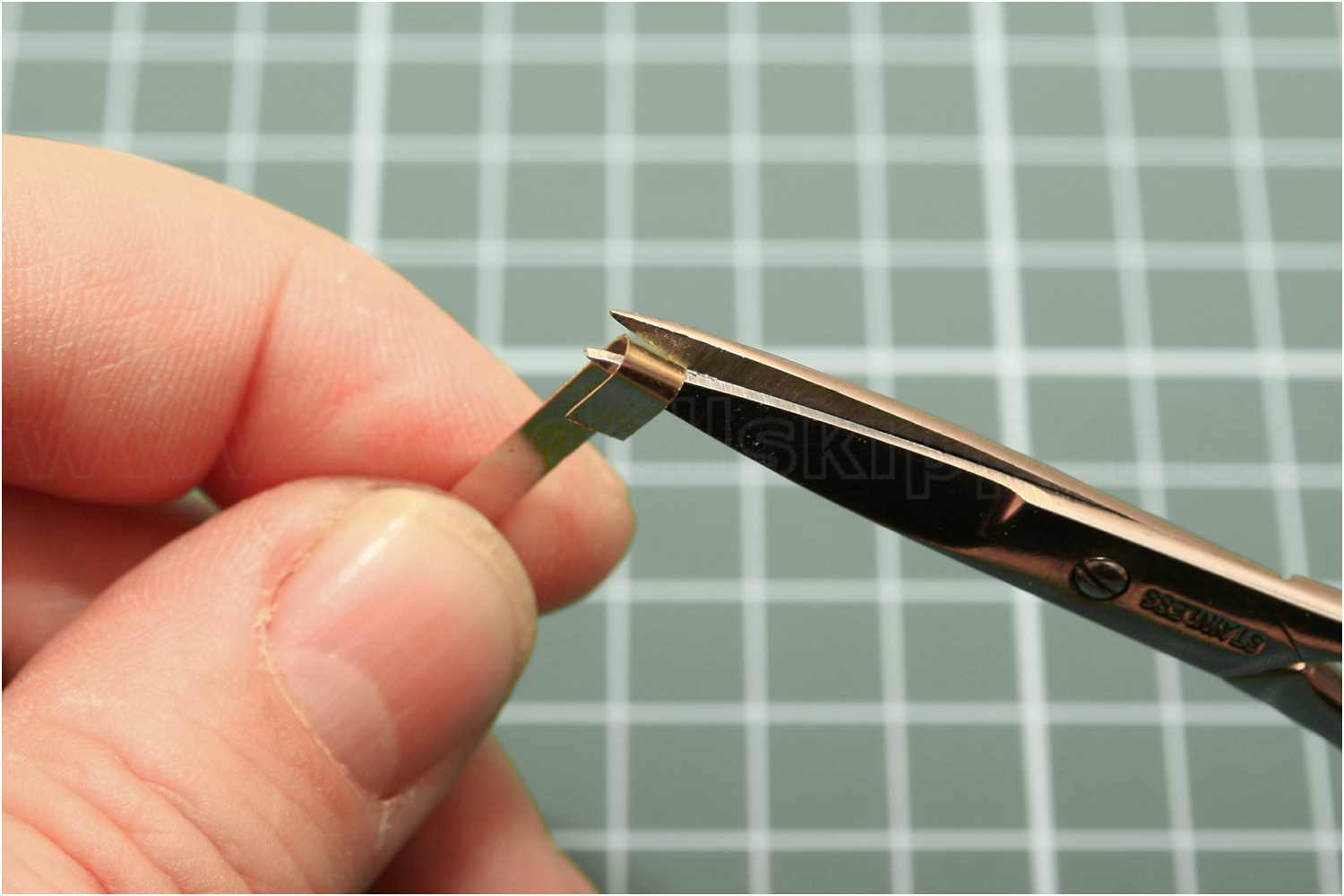 Nun wird das Scharnierband an das Messingröhrchen angeformt. Dabei sollte darauf geachtet werden, dass der Messingstreifen möglichst passgenau am Röhrchen anliegt.