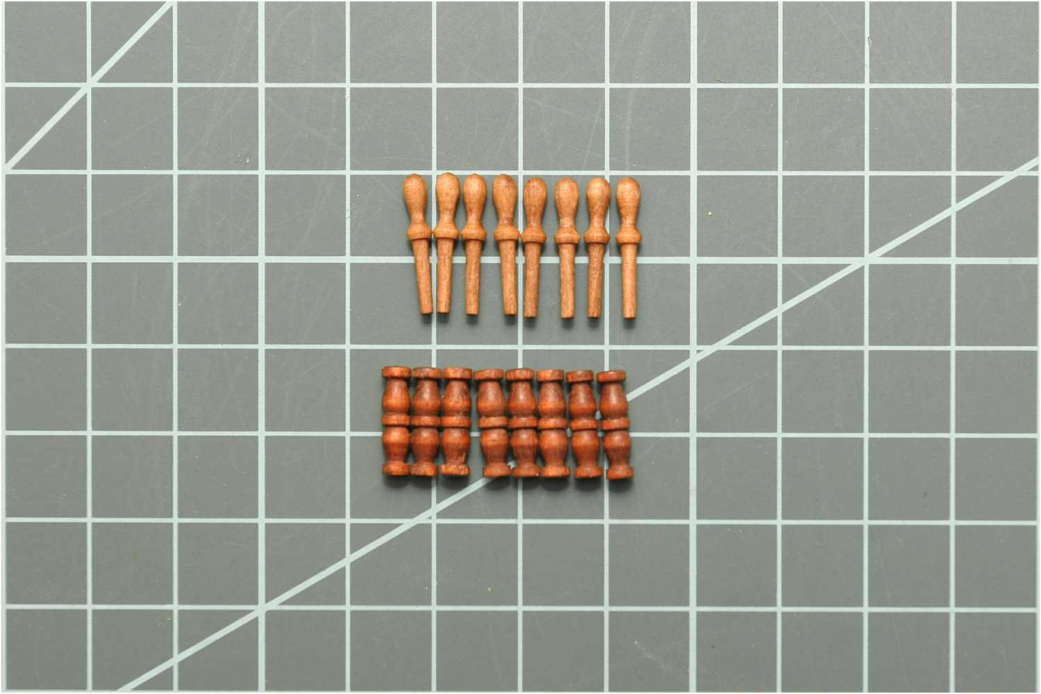 Für die Speichen kommen acht gedrechselte Geländerstützen und für die Handgriffe acht Koffeenägel zum Einsatz, die sonst bei historischen Modellen Anwendung finden.