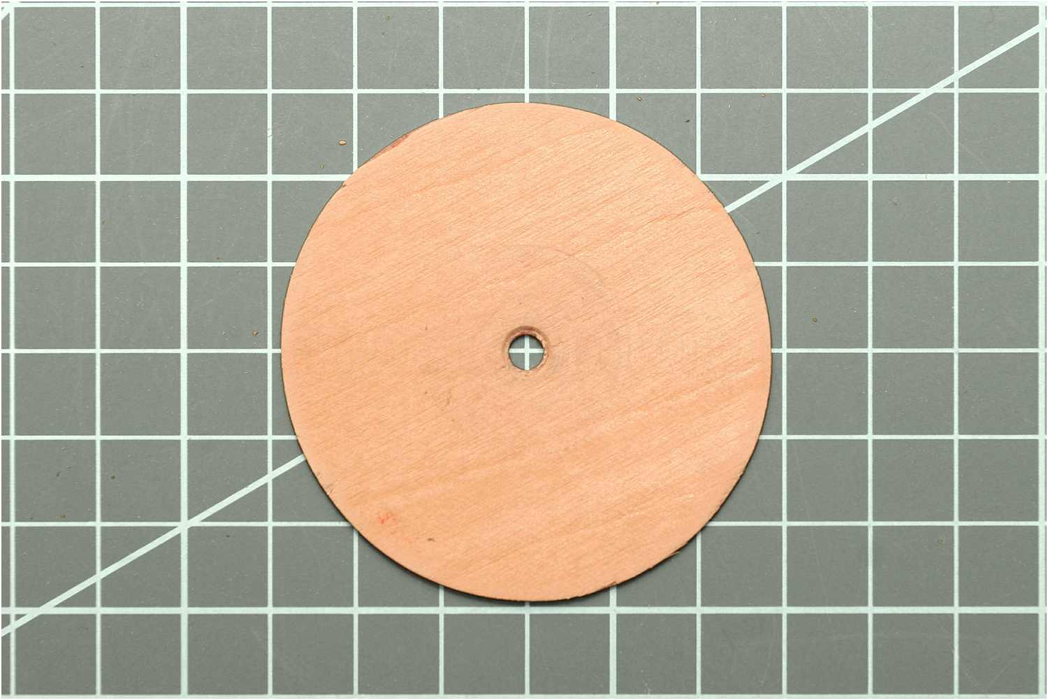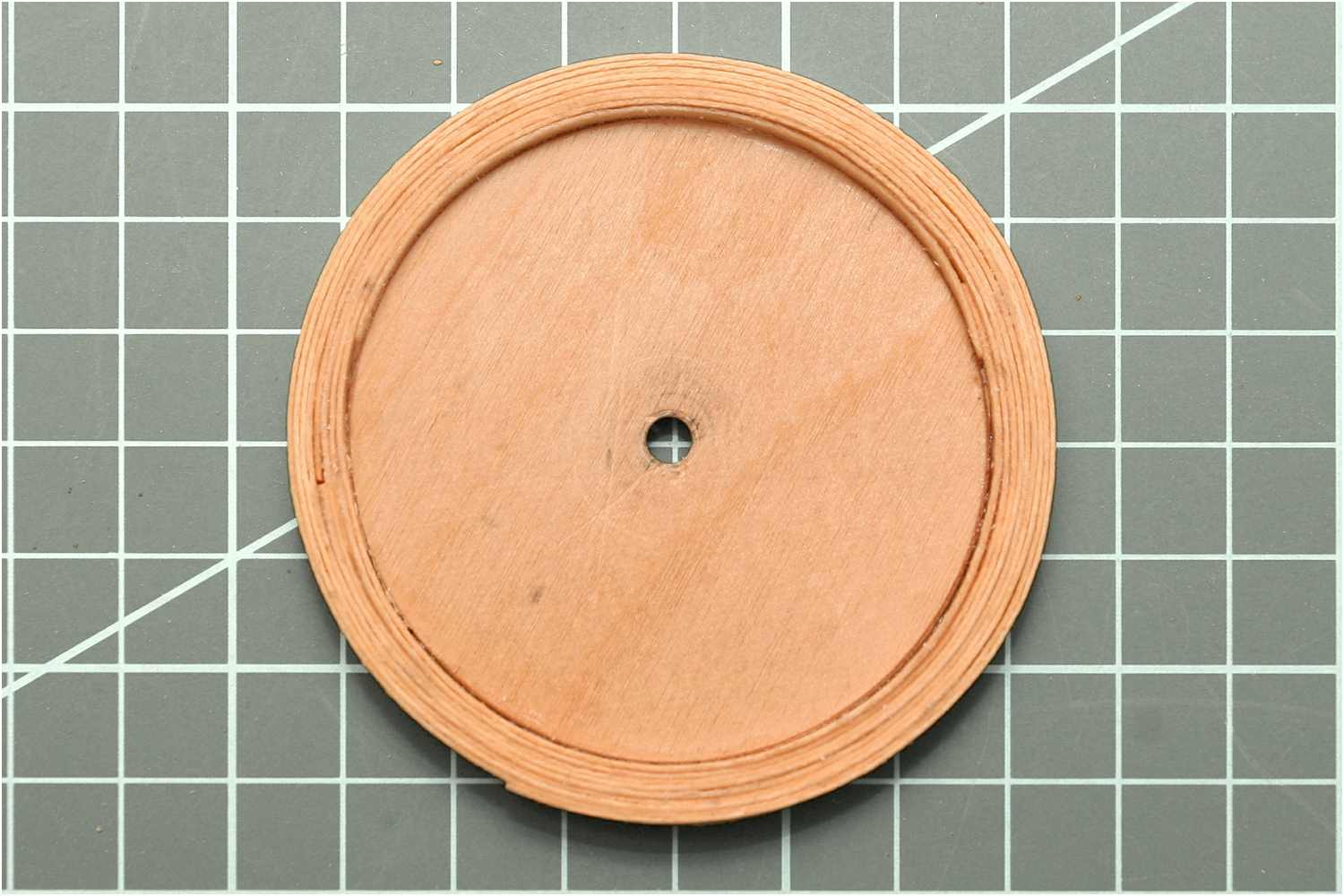 Jetzt kann der Außendurchmessers des Steuerrades ermittelt und für die Herstellung des äußeren Handlaufs eine entsprechende Schablone aus 1 mm Sperrholz erstellt werden, diese grob ausschneiden und wieder in der Handbohrmaschine rund schleifen.