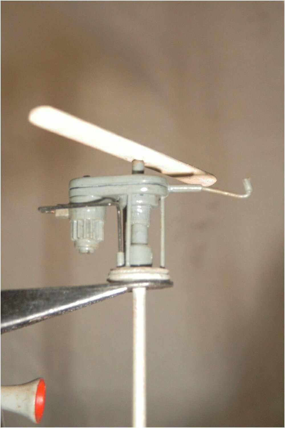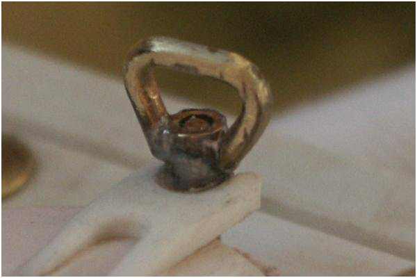 Eine vergrößerte Aufnahme, mit der ''echt'' funktionierende Flügelmutter aus 1 mm Messingdraht, respektive dazu auch das M1-Gewinde der Hülse und des Schraubbolzen.