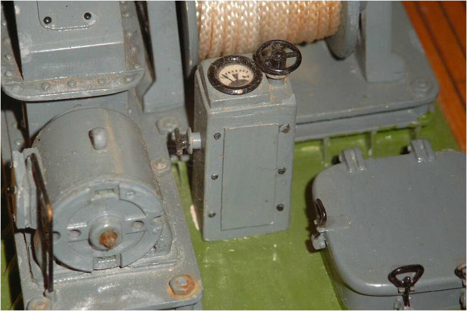 Der Motor ist, wie schon bei der Ankerwinde, aus einem ausrangierten Servomotor entstanden. Die Rückwand des Motors ist nicht ganz originalgetreu, aber sieht besser aus, als eine plane Fläche.