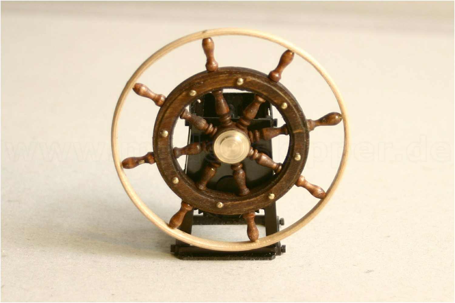 Solche Steuerräder bekommt man nicht im Handel zu kaufen, also muss man es selbst bauen. Die Verwendung von handelsüblichen Belegnägeln und Geländerstützen aus dem historischen Schiffsmodellbau erkennt man erst bei näherer Betrachtung
