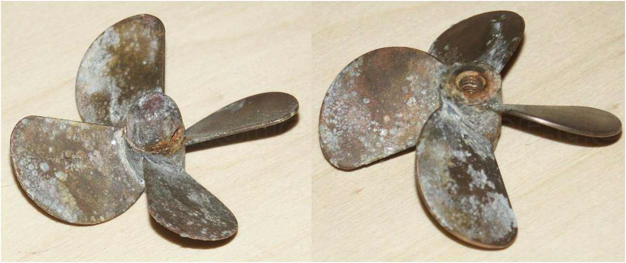 Der ganze Vorgang dauerte ungefähr eine Viertelstunde. Dunkle Verfärbungen am Messing waren zu erkennen. Nachdem ich den Propeller mit einem Lappen gesäubert hatte, konnte man deutlich die kupferne Farbe sehen. Die Salzlauge hatte sich rostbraun gefärbt.