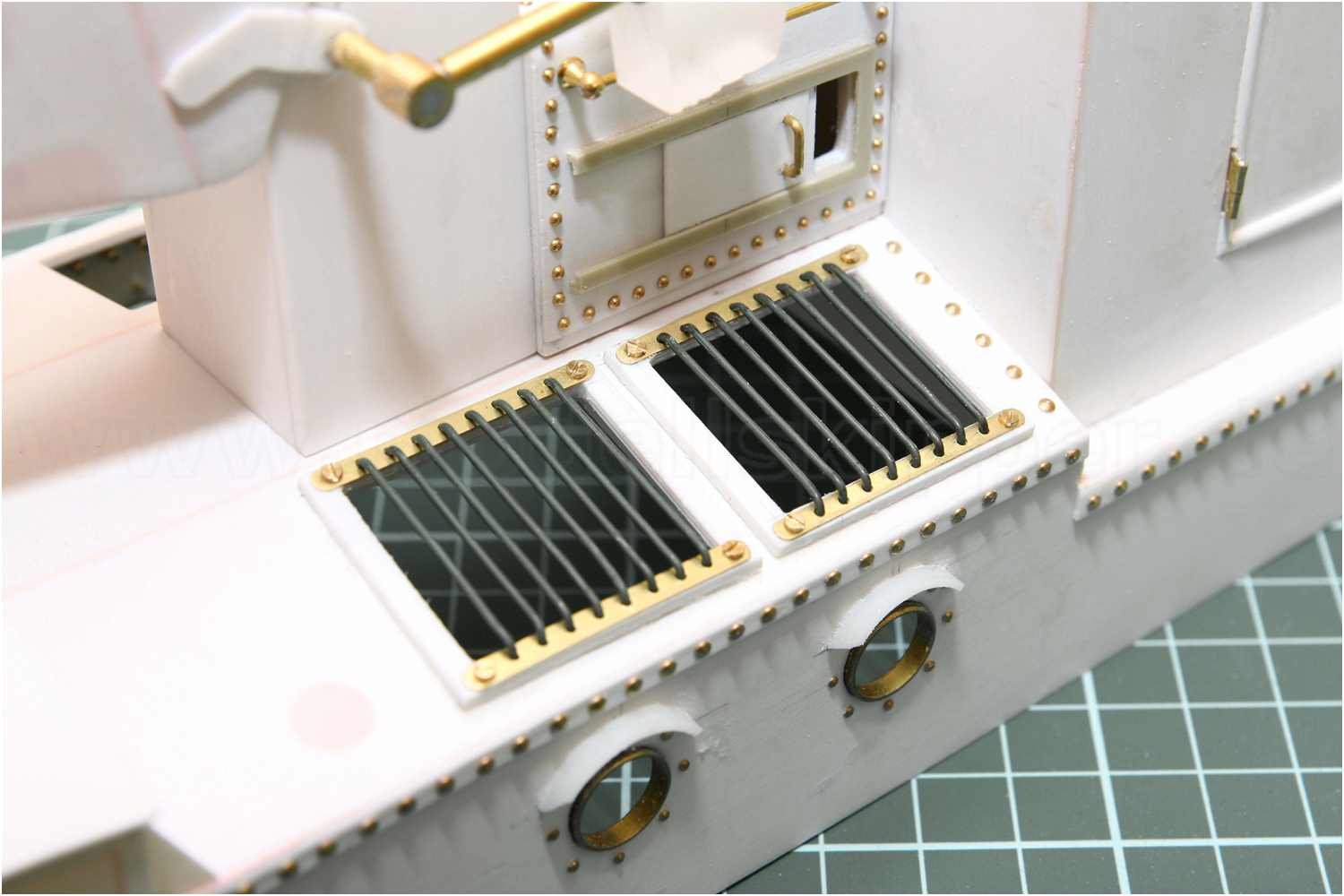 Um bei Schutzgittern, wie z.B. bei diesen Oberlichtern, für alle Gitterstäbe die exakte Höhe zu erhalten, verwendet man einfach einen Abstandshalter. Dieser Abstandshalter kann ein Stück Sperrholz, eine Leiste oder ein Rest Kunststoffabfall sein.