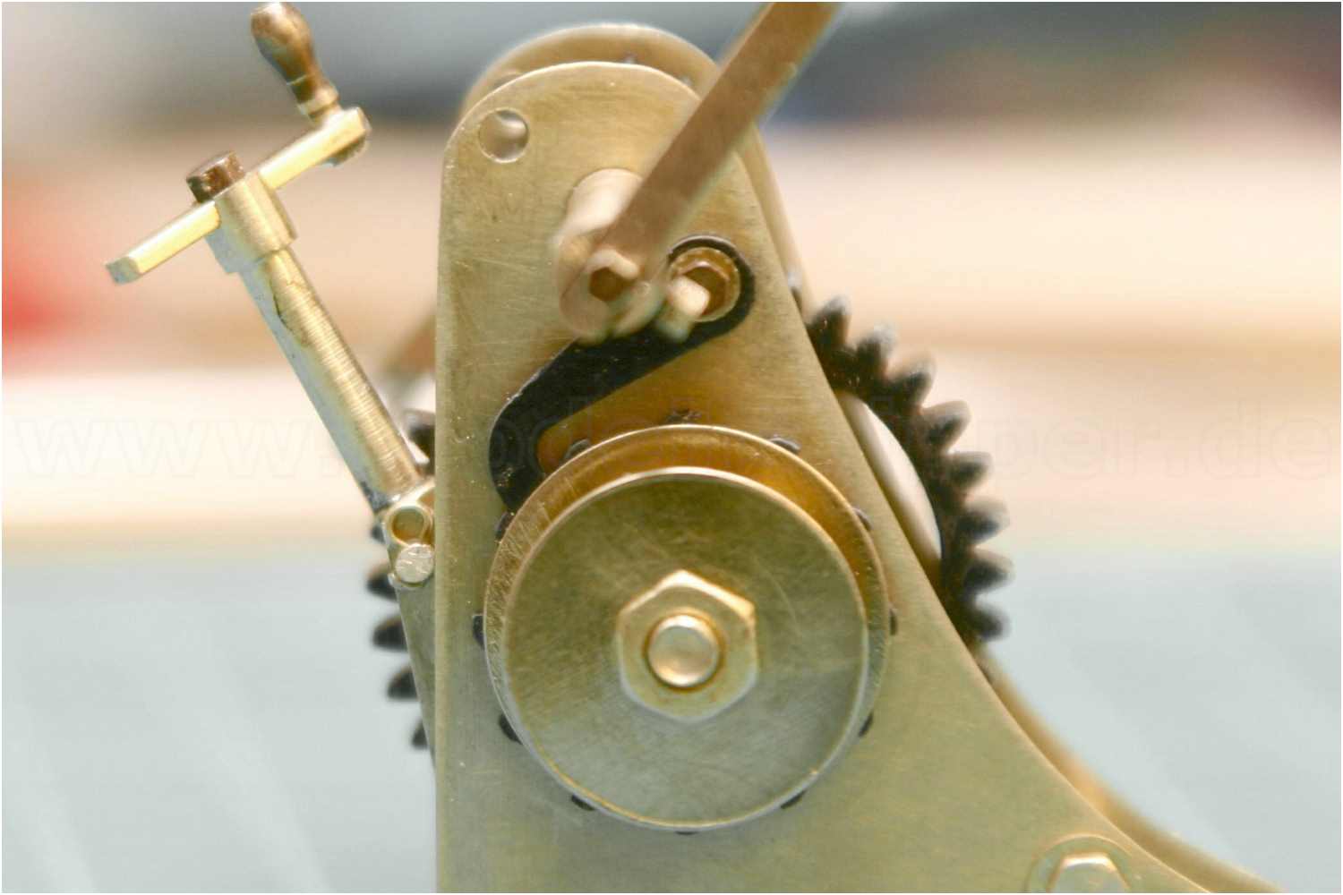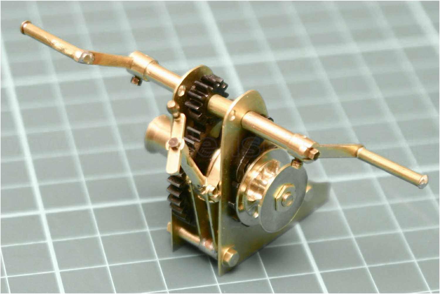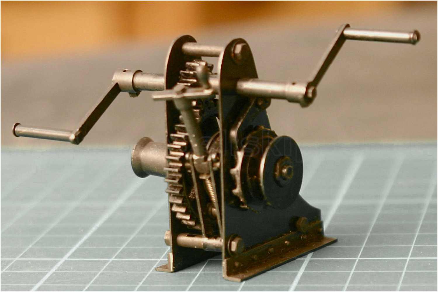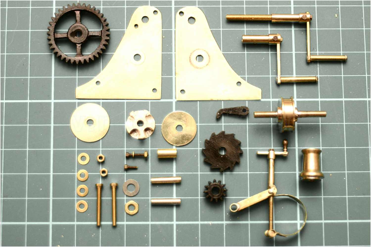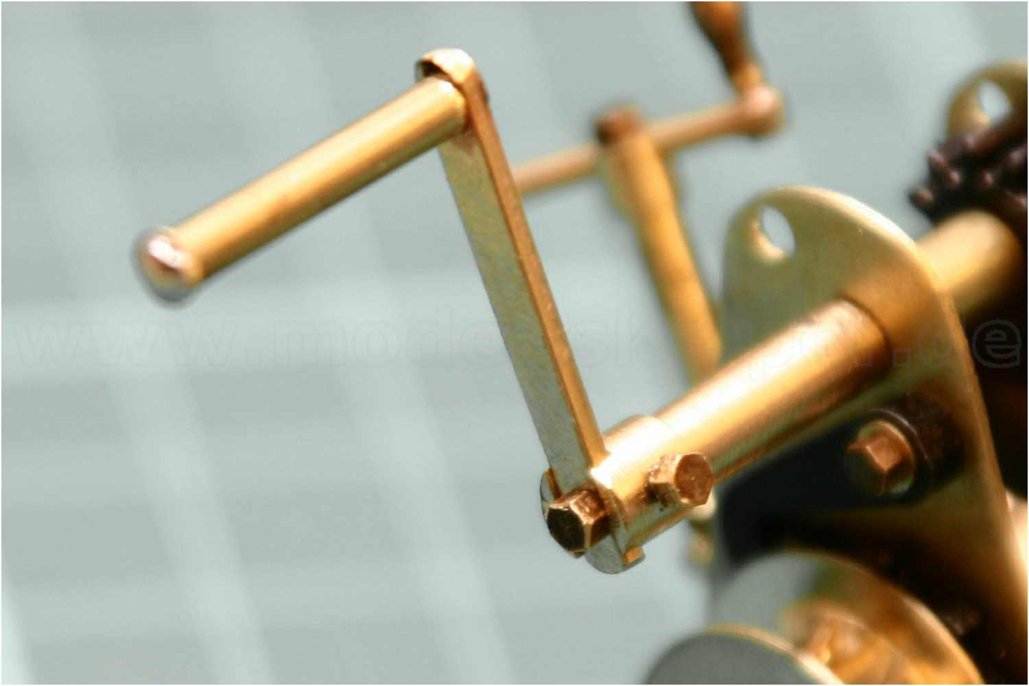Man beachte die einfache und doch effektive Befestigung der Handkurbel. Es wurden Sechskantschrauben mit 1,2 mm Gewinde verwendet. Auch funktionstüchtig sozusagen, man könnte die Schrauben jederzeit wieder rausdrehen, da ich in die Kurbelachse ein entsprechendes Innengewinde geschnitten habe. Die Handgriffe der Kurbeln sind Messinghülsen und ebenfalls ''gängig''.
